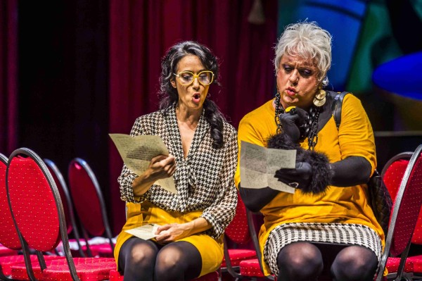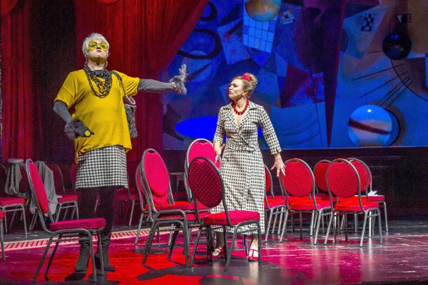 Takahiro Nagasaki und das Philharmonische Orchester der Hansestadt Lübeck feiern diese musikalische festa furiosa nicht nur mit hörbarem Spaß an der Sache, sie arbeiten auch die differenzierten Klangfarben fein und klar heraus. Farbig, ja knallbunt ist ebenfalls das Bühnenbild von Stefan Heinrichs, von Joan Mirós Bildern inspiriert. Dazu passen die Kostüme von Ilona Holdorf-Schimanke – alles ist natürlich parodistisch übertrieben, aber nicht albern überzogen. Das trifft insgesamt für die Produktion zu; es ist kein Klamauk-Theater, sondern ein Riesenspaß mit bezaubernden Ideen. Lediglich die Verzerrung Ersilias als Klofrau, die eine vergoldete Toilette schrubbt, wirkt etwas überzogen. Aber es ist ein Gesamtkunstwerk zum Tränenlachen mit großartigen Leistungen der Solisten.