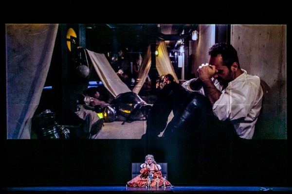 Und auch gesanglich wird einiges geboten am Theater am Bismarckplatz, das Haus stemmt die Produktion ausschließlich mit eigenen Kräften. Deniz Yilmaz ist dabei ein klanggewaltiger, stimmlich präsenter Otello mit eindrucksvollen Höhen voller Strahlkraft, beeindruckenden Ausbrüchen und Gänsehaut erzeugenden leiseren Passagen. Lediglich darstellerisch könnte der türkische Tenor noch eine halbe Schippe draufpacken, um sein Rollenportrait noch überzeugender zu gestalten. Die Rumänin Theodora Varga ist seit 10 Jahren Ensemblemitglied in Regensburg, glänzt als Desdemona mit einer ausgefeilten Charakterstudie ihrer Figur; man spürt förmlich, wie es Desdemona bei den Anschuldigungen ihres Mannes den Boden unter den Füßen wegzieht. Varga beeindruckt mich zudem vor allem mit klanglicher Anmut und anbetungswürdigen Piani. Die Hauptfigur am gestrigen Abend ist sicher der Jago von Seymur Karimov. Er imponiert mir mit endlos erscheinendem Atem, mischt seinem profunden Bariton immer wieder zwielichtig schimmernde Farben bei und zeigt auch darstellerisch mehr als überzeugend den von der Regie gezeichneten Psychopathen.