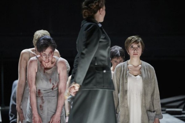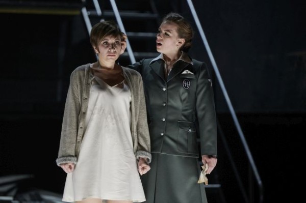 Dabei ist der Dampfer aber dennoch äußeren Veränderungen unterworfen. Wenn sich die erste Auschwitz-Szene ankündigt, beginnen die Lagerinsassinnen, das leicht ansteigende Sonnendeck in seine Bestandteile zu zerlegen. Sie entfernen einzelne Holzlatten und kreieren emsig eine neue Spielfläche, die ein marodes Überbleibsel der alten ist. Bereits vorher hat sich eine mitreisende Mutter als Oberaufseherin entpuppt. Auch kostümmäßig wird der Wechsel der Ebenen ansprechend gelöst. Marta zieht das Kleid, das sie auf dem Schiff trägt, aus und verbringt die Auschwitz- Szenen in einem weißen Unterkleid. Dann hilft sie Lisa, sich ihres schicken Kleides zu entledigen. Behende legt die Aufseherin eine SS-Uniform an, die ihr die kleine Tochter der Oberaufseherin in einem Paket gebracht hat. Die Zeichnung der Lisa ist Schmeding besonders gut gelungen. Er lässt keinen Zweifel daran aufkommen, dass wir es hier mit einer durch und durch bösen Person zu tun haben – sie ist es, die im Konzertbild wütend Tadeusz’ Geige zertritt -, die auf der anderen Seite aber auch sehr erotisch anmutet. So verbringt sie im zweiten Akt in ihrer Szene mit Walter lange Zeit in Unterwäsche und geniert sich dabei auch vor dem dazukommenden Steward nicht. Wenn sie sich einmal innig an Marta schmiegt, wird nur zu deutlich, dass sie die Häftlingsfrau begehrt. Lisas Ehemann bekommt immer mehr von ihren schlimmen Taten mit. Oft geht er an Stellen über die Bühne, an denen Weinberg und Medwedew eigentlich gar keinen Auftritt für ihn vorgesehen haben. Das Verständnis des Regisseurs für Tschechow’sche Elemente wird auf diese Weise offenkundig. Ein weiterer Kniff der Regie ist eine teilweise Pausenbespielung der Bühne nach dem ersten Akt. Noch während die Besucher den Zuschauerraum verlassen, hält sich Walter entsetzt ein Taschentuch vor Mund und Nase, während Lisa auf erhöhter Warte stehend um ihre Ehe fürchtet. Eine gute Idee war es auch, die SS-Männer mit Gasmasken auftreten zu lassen. Da wurde ganz klar, dass sie unmittelbar vorher Juden vergast hatten. Im zweiten Akt waren das Martas Freundinnen. Insgesamt sind Schmeding Bilder von ungemeiner Eindringlichkeit gelungen. Und in Sachen Personenregie erwies er sich als wahrer Meister. Die zwischenmenschlichen Beziehungen wurden von ihm grandios ausgelotet. Langweilig wurde es wahrlich an keiner Stelle. Das Ganze atmete eine perfekte innere Geschlossenheit und enorme Spannung, die einen ganz in seinen Bann zog. Sicher handelt es sich hier um eine der besten Deutungen dieses anspruchsvollen Werkes, wofür dem Regieteam großes Lob auszusprechen ist. Das war atemberaubendes Musiktheater!