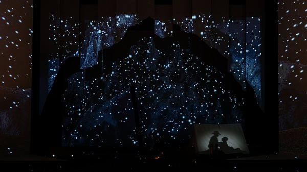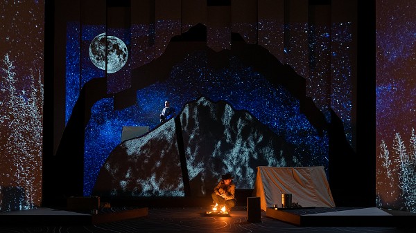 Der Film setzt über weite Strecken auf die herbe Schönheit der Berglandschaft, in der die beiden jungen Männer einen Sommer lang Schafe hüten. Auch die inszenierende Intendantin Cathérine Miville setzt zu Beginn der Aufführung auf die starken Videoeinblendungen, die Marc Jungreithmeier erstellt hat. Diese entfalten oft eine atmosphärische Wirkung, entgehen aber nicht immer der Gefahr des schieren Naturalismus mit Bergwelt samt Schafherde und schrammen mit einem malerischen Sternenhimmel haarscharf am Kitsch vorbei. Hübsch anzusehen sind diese Videos aber durchweg. Sie fügen sich zudem gut in das Bühnenbild von Lukas Noll ein. Dieses stellt sehr suggestiv den titelgebenden Berg in den Mittelpunkt. Dessen gezackte, schroffe Silhouette ist immer präsent.