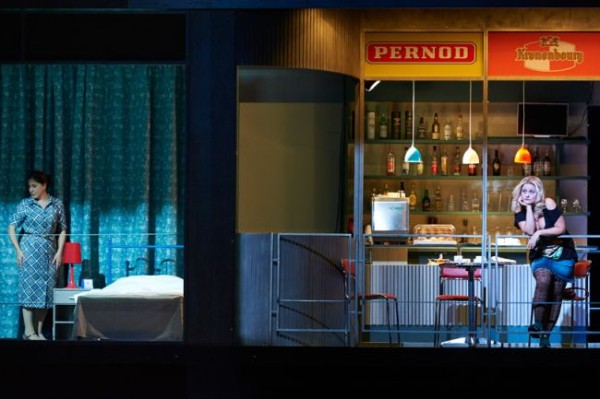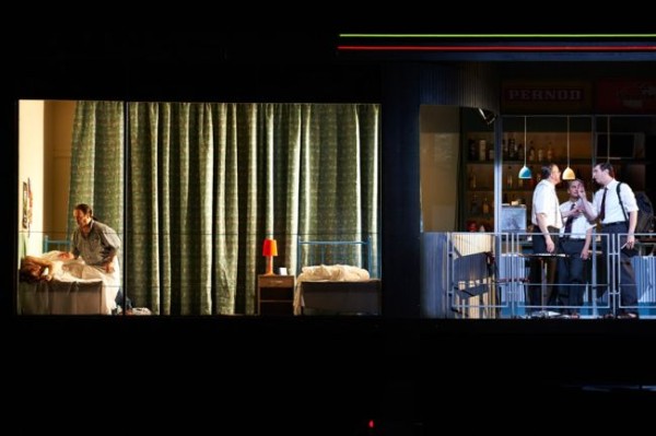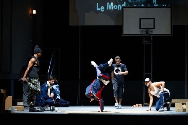Wenn sich der Vorhang hebt, erschließt sich dem Blick ein nach vorne offenes Gebäude in einem etwas heruntergekommen anmutenden Banlieu einer französischen Großstadt – vielleicht Paris, wo Meyerbeer einen seiner beiden Hauptwohnsitze hatte (der andere war Berlin). Oben rechts befindet sich die Kneipe des späteren Propheten Jean van Leyden, links davon das Schafgemach, das er sich mit seiner Mutter Fidès teilt, zu der er in einer ganz eigenen Beziehung steht. Er kann sich nicht entscheiden, ob er sie oder seine Braut Berthe mehr liebt und schwankt zwischen Mutter- und Geschlechtsliebe hin und her. Im unteren linken Bereich sieht man die Einfahrt einer Garage, rechts unten ein Getränkelager, in dem die Mitglieder der Stuttgarter Truppe TruCru /Incredible Syndicate mit sehr beachtlichen Sporteinlagen aufwarten. Sie sind es auch, die während der großen Ballettszene des zweiten Aktes mit Hilfe eines ungemein beeindruckenden rasanten Breakdance und fulminanter Akrobatik einen erheiternden Kontrapunkt in dem ansonsten recht dramatischen Geschehen setzen, wofür ihnen großes Lob gebührt. Das war eine äußerst gelungene, fetzige Angelegenheit. Wenn sich das Haus dreht, kommen ein Basketball-Platz und eine Treppe zum Vorschein, die den Volksmassen genügend Platz für ihre Versammlungen bieten. An der Seite ist ein leicht demolierter Polizeiwagen abgestellt, in dem Berthe zuerst von dem vom Grafen zum Polizeichef mutierten Oberthal und dann von einem seiner Polizisten vergewaltig wird. Das Auto geht im weiteren Verlauf des Abends in Flammen auf. Später wird noch ein Junge in einer Stretchlimousine missbraucht. Es ist ein von Gewalt, Drogen und Arbeitslosigkeit beherrschtes Ambiente, das das Regieteam hier mit enormem Nachdruck zeichnet und überzeugend einige essentielle Probleme unserer Zeit heraufbeschwört.