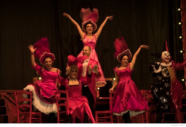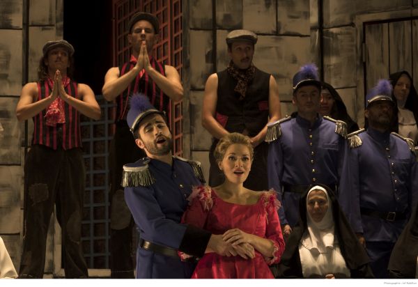 Lara Neumann debütierte als Denise de Flavigny, die keusche Novizin, die über Nacht zur Operettensängerin „Mam’zelle Nitouche“ mutiert („Fräulein rühr mich nicht an“, auf deutsch: „Scheinheilige“). Neumann ist ursprünglich ja Schauspielerin, was es ihr ermöglichte die langen gesprochenen Dialoge (das Palazzetto bestand auf einer ungekürzten Fassung), die vielen blitzschnellen Verkleidungen und dazu auch noch die teilweise akrobatischen Tanzeinlagen blendend zu meistern. Ihr zur Seite wirkte Damien Bigoudan in der Doppelrolle des schüchternen Kirchenorganisten Célestin und des wilden Operettenkomponisten Floridor szenisch und stimmlich etwas blass, was noch verstärkt wurde durch seinen jungen „Rivalen“, dem sehr spielfreudigen Tenor Samy Camps, der als vicomte Fernand de Champlâtreux mit der schönsten Stimme des Abends auftrumpfen konnte (für sie wurde er auch 2015 für den „Victoire de la Musique“ nominiert). Camps folgte, so wie alle Soldaten auf der Bühne, den Befehlen des strengen Majors der Kaserne in Pontarcy, des comte de château-Gibus (der Schauspieler Eddie Chignara), pikanter Weise auch der Bruder der Kloster-Oberin, der er regelmäßig seine Eskapaden in der Halbwelt des Theaters „beichtete“. In der Doppelrolle der strengen „mère supérieure du couvent des hirondelles“ (Oberin des Klosters der kleinen Schwalben unserer lieben Frau) und der leichtlebigen Operettensängerin Corinne wurde im Programmheft Miss Knife angegeben, die sich beim Schlussapplaus entpuppte als Olivier Py, der auch noch die Rolle des immer betrunkenen und laut singenden Soldaten Loriot (vortrefflich) sang. Das war für viele „die Überraschung des Abends“, denn Py ist zur Zeit Direktor des Theaterfestivals in Avignon und seit vielen Jahren in Frankreich bekannt für seine starken politischen Stellungnahmen – niemand hätte ihm zugetraut, dass gerade er als Transvestit in einer Operette auftreten würde. Doch Py führt anscheinend heute ein ähnliches „Doppelleben“ wie damals der Komponist Hervé.