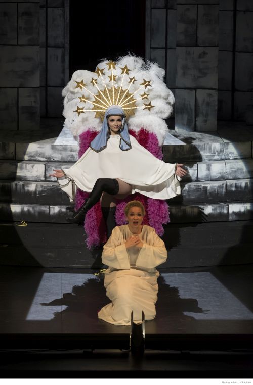 Nonne Lydia (Clémentine Bourgoin) verwandelt sich zur frei erfundenen "Sainte Nitouche" während des Gebetes der Novizin Denise de Flavigny (Lara Neumann), die von einem Abenteuerleben auf der Operettenbühne träumt