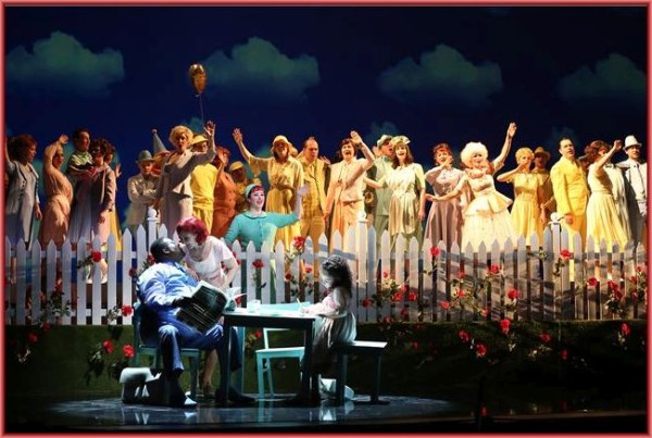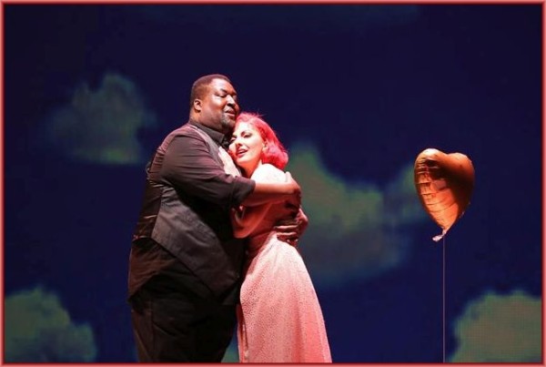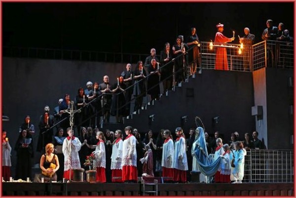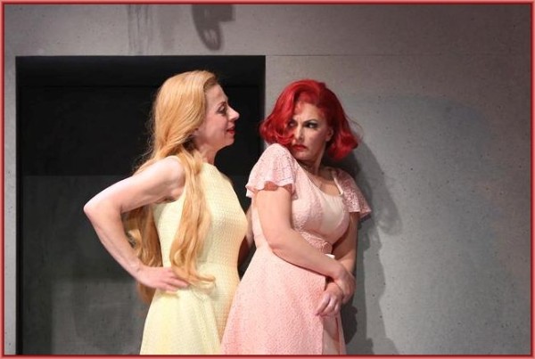 Regisseur Holger Potocki findet für seine überzeugende Interpretation dennoch einen ganzheitlich verbindenden Ansatz. Er siedelt die Handlung in nahezu zeitloser, trist gehaltener Kulisse einer Mole am Hafen an. Alle sind in Schwarz und Grau gehüllt, die Tristesse ihres Daseins wird scheinbar nur von ihrer Religion und ihrem Glauben erhellt, denn der Klerus kommt in Rot daher. Rot ist auch das Haar von Lola, die blonde Santuzza wird von der Gemeinschaft als ledige Schwangere ausgegrenzt. Sie muss deshalb unbedingt erreichen, dass Turridu sie nimmt, statt sich wieder seiner Geliebten zuzuwenden. Als dies nicht gelingt, verrät sie Alfio von den Eskapaden seiner Frau, wird verrückt und träumt das fatale Ende. Verlassen und dem Wahn verfallen, sieht sie ihr Heil nur im Freitod. Der Bühnenaufbau in Tascas Werk ist zu Beginn offener (Bühne: Lena Brexendorff), auch die wunderbaren bonbonfarbenen Kostüme von Katja Schröpfer sind lebensbejahend. In die heile Welt der improvisierten Familie von Ciccillo und seiner rothaarigen Rosella, kommt die Ausweglosigkeit erst durch die Intrigen der blonden Maria. In den Intermezzi, die es in beiden Werken gibt, verwandelt sich die Protagonistin in Videoeinspielungen, für die Markus Schmidt verantwortlich zeichnet, in die jeweilige Rivalin: die blonde Santuzza wird rothaarig, die rothaarige Rosella blond. So schließt sich der Kreis auch im eindrucksvollen Schlussbild von „A Santa Lucia“, das dem Blick auf die Szenerie der „Cavalleria rusticana“ gleicht, als sich am gestrigen Abend erstmals der Vorhang gehoben hatte. Dem zwischen den Szenen von Scheinwerfern geblendetem Publikum wird während des ganzen Abends eine Art Diashow präsentiert, ein Kaleidoskop der menschlichen Begehrlichkeiten, mit allen Zutaten, die die Suche nach Liebe und die Enttäuschung derselben mit sich bringen kann. Ein szenisch eindrucksvoller Abend mit Wow-Effekt.