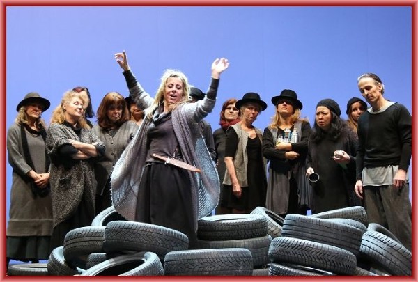 Der große Tenor Enrico Caruso hatte einmal erklärt, dass man für eine erfolgreiche Aufführung des „Troubadour“ nur die vier besten Sänger der Welt brauche. Und an dieser Aussage hat sich bis heute nichts geändert. Und Dessau kommt schon verdammt nahe an diese Aussage heran. Inszeniert wird die dramatische Mär von Rebecca Stanzel uns sie tut dies einfach und schnörkellos. Es wird nichts hineingedeutet, die blutige Geschichte wird stimmig erzählt. Ein eigentlich spartanisches, aber dennoch beeindruckendes Bühnenbild und zurückhaltende Kostüme werden von Markus Pysall beigesteuert. Die einzigen Requisiten sind eigentlich Autoreifen in allen Variationen, die eigentlich für alles dienen. Na gut, mein Geschmack ist es zwar nicht so, aber es stört nicht weiter – und das ist heutzutage schon viel. Alles ist nüchtern und zweckgebunden und lenkt daher das Auge (und das Ohr) des Betrachters auf das eigentlich ausschlaggebende, die Musik. Videoeinspielungen von Barbara Janotte sorgen für weitere Stimmung, meist düster und beeindruckend.