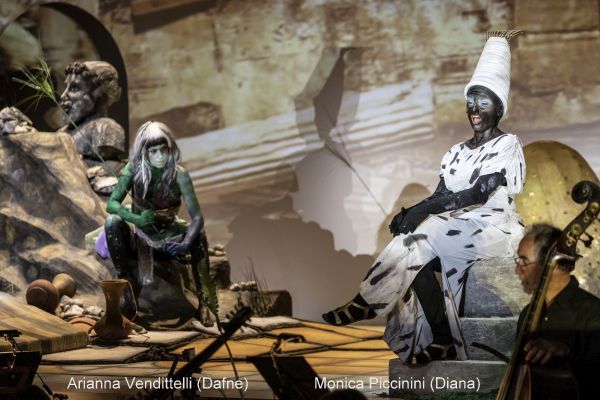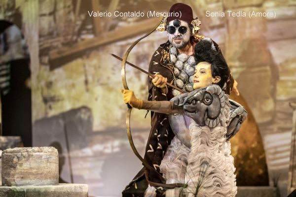 Aber auch die anderen Partien sind ausgezeichnet und absolut rollendeckend besetzt. Sonia Tedla (Amore) und Valerio Contaldo (Mercutio) überzeugen mit drastischen Tönen. Sonia Tedla zieht lausbubenhaft als Amore die Fäden des Geschehens und singt gebührend soubrettenhaft. Valerio Contaldo ist ein handfester, gegen Ende gar heldischer Tenor, der seine Koloraturen nicht nur sicher singt, sondern auch sehr wirkungsvoll zur Charakterzeichnung einsetzt. Dazu kommt die erfahrene Sopranistin Monica Piccinini als rätselhafte Göttin Diana. Sie hat von den drei Damen das kleinste Stimmvolumen, artikuliert ausgezeichnet und hebt sich mit ihrer lyrischen Stimmgebung markant von der energischen Dafne und dem quirligen Amore ab. Das ist in dieser Besetzung mit drei hohen Frauenstimmen und zwei hohen Männerstimmen eine wichtige Qualität. Rätseln mag man, warum sie als Schwarze in weißem Kleid auftritt – vielleicht die Symbiose von schwarzer und weißer Göttin, also von Tod und Leben? Jedenfalls ein optisch reizvolles Bild zwischen den übrigen grellen Kostümen.