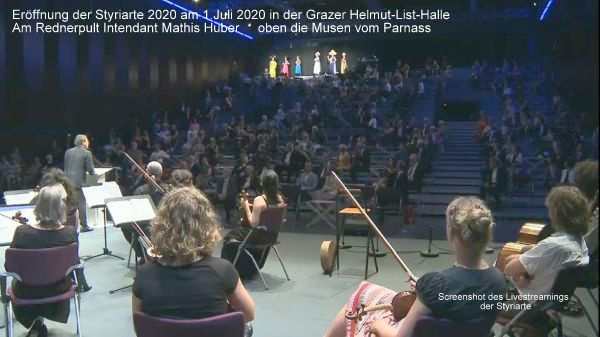 Dem seit 30 Jahren erprobten und stets vorwärtsblickenden Styriarte-Intendanten Mathis Huber ist es gelungen, die Corona-Situation effektvoll und klug zu Neuem zu nutzen! Er beklagte in Corona-Zeiten nie die staatlichen Pandemie-Regelungen, sondern arbeitete konsequent und optimistisch mit seinem Team an einer Umarbeitung des ursprünglich vorgesehenen Programms. Dieser Mut wurde belohnt: seit 1.Juli ist es zulässig, für 250 Personen in geschlossenen Veranstaltungsräumen zu spielen. Und sofort an diesem ersten Tag eröffnete die Styriarte mit einem wahrhaft zeitgemäßen Barock-Spektakel, das nicht nur die Entdeckungsreise durch die Meisterwerke des großen steirischen Barockkomponisten Johann Joseph Fux fortsetzte, sondern uns gleich auch noch die Uraufführung einer „Minioper“ bescherte, die in wahrer Rekordzeit entstanden und einstudiert war. So konnte man also wesentliche Teile der geplanten Fux-Oper erleben, die ein Auftragswerk des kaiserlichen Hofes war und nur ein einziges Mal im August 1709 aufgeführt wurde – und das verschränkt mit einem mehr als 300 Jahre später geschriebenen Auftragswerk, das bei der diesjährigen Eröffnung wohl auch nur dieses einziges Mal erklungen sein wird, ist diese Minioper doch untrennbar mit dem Auftreten der politischen Prominenz verbunden. Die Repräsentationsbedürfnisse der Habsburger-Zeit wurden so effektvoll mit unserer heutigen Zeit gespiegelt.