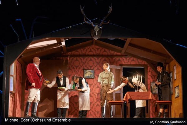 Für dieses in sich konsequente Regiekonzept haben Philipp Nikolai (Bühne) und Sonja Albartus (Kostüme) die passende optische Umsetzung beigesteuert – allerdings mit dem Nachteil, dass dadurch die Spielfläche der ohnehin schon kleinen Klagenfurter Bühne noch mehr eingeengt wurde, was speziell in der engen Waldhütte des dritten Aufzugs dazu führt, dass keine schlüssige Personenführung mehr möglich ist. Wer den Rosenkavalier nicht kennt, der wird den ersten Teil des dritten Aufzugs nicht erfassen können.