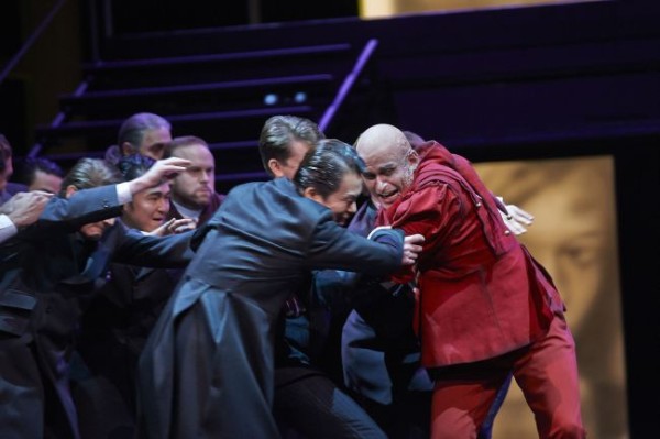 Bleibt noch die Inszenierung von Brigitte Fassbaender, die insgesamt nicht sonderlich zu befriedigen vermochte. Sie und ihre Bühnen- und Kostümbildnerin Dorit Lievenbrück huldigten optisch der sog. Neuen Sachlichkeit. Sie siedeln die Handlung in einer metallenen Treppenformation an, die sich im dritten Akt dreht und dann die Behausung Sparafuciles und Maddalenas bildet. Dabei entsteht der Eindruck, die mörderischen Geschwister würden unter einer Brücke hausen. Ihr Hauptaugenmerk richtet die Regisseurin auf die zwischenmenschlichen Beziehungen. Das Obsessive in der Beziehung zwischen dem im herkömmlichen roten Narrengewand auftretenden Rigoletto und Gilda, der ein riesiger Plüsch-Teddybär als Ausdruck ihrer Kindlichkeit zugeordnet ist, wird von ihr einfühlsam herausgearbeitet. Auch nimmt Frau Fassbaender der Titelfigur ihren traditionellen Buckel und lässt tiefe Narben an dessen Stelle treten. Das wird offenkundig, wenn der glatzköpfige Narr zum zweiten Bild hin seinen Oberkörper entblößt. Ein guter Einfall war, dass der Duca im zweiten Akt vor den Photos seiner erst verführten, dann einfach weggeworfenen Verflossenen agiert, zu denen sich dann auch das Bild Gildas gesellt.