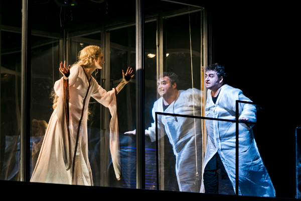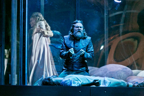 Dies erklärt sich: in Regensburg, wo tatsächlich viele Opernfreunde das weltbekannte Werk nicht kennen, ist es tatsächlich nötig, die Geschichte bildlich zu erzählen. Wagners „Handlung“ setzt bekanntlich fast alles in die Erzählung: eine relative Zumutung für all jene, die mit den Dimensionen des Werks nicht vertraut sind. Die Regie kommt ihnen entgegen, indem sie immer wieder das ziemlich ideal aussehende Liebespaar und Figuren zeigt, die in keiner modernen Aufführung (mit Ausnahme von Stefan Herheims Berliner „Lohengrin“) auftreten dürften – als befänden wir uns, mit allen alten und sehr langen Bärten, in einem Mittelalterfilm. Die „historische“ Sphäre hat man in und vor einen (von Clement und Sanôu entworfenen) Glaskubus verbannt, in dem sie die Geschichte noch einmal spielen: der Verrat Tristans und Isoldes, die nachts aus dem Ehebett aufsteht, sich die Scham wäscht und zu Tristan eilt, um mit ihm, das wird gezeigt, im Wiegeschritt der Musik des Liebesduetts – pardon, aber man muss das so ausdrücken – zu vögeln. Nun ist aber diese Liebesgeschichte nicht allein eine Geschichte der sexuellen Leidenschaft. Wenn sich Tristan und Isolde begegnen, dann regieren die Erotik – und die Zärtlichkeit. Lotte de Beer erweist sich dort als Schülerin ihres Meisters Peter Konwitschny, wo sie innige Gesten zeigt. Tatsächlich: Tristan und Isolde dürfen sich umarmen – und küssen! Genau genommen handelt es sich hier um die schärfte Gangart eines selbstbewussten, mutigen „Regietheaters“, die möglich ist, denn diese Lesart von Wagners Oper ist denkbar weit entfernt von den skeptischen Deutungen der letzten Jahre, in denen sich die Liebenden nicht berühren, nicht anziehen, nicht ausziehen. Sie vertraut auf die Utopie der Liebe: indem sie demonstriert, dass in der Musik schon alles drinsteckt, was von den Vertretern einer negativen Theologie der Liebe geleugnet wird: Nähe, Freude, Intimität, Hingabe – und sei es eine Hingabe, die nur im Traum möglich werden kann, weil der „Krampf“ (wieder so ein Wagnerwort) zumal des langen Sterbe-Akts nur dann verständlich wird, wenn man akzeptiert, dass zwischen den Liebenden tatsächlich ein traditioneller Begriff von Liebe mitspielt. Vielleicht spielt er angesichts von Tristans seltsamen Todeswünschen nicht die Hauptrolle – aber es ist schön, dass die neben Romeo & Julia „berühmteste Liebesgeschichte des Abendlandes“ in Regensburg zunächst einmal von Tristans Kopf auf die nackten Füße Isoldes gestellt wird.