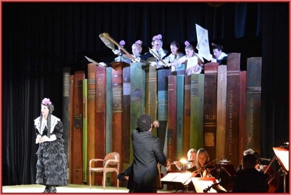 Hervorzuheben ist auch noch Alexander Krampe, der für die Bearbeitung und die Arrangements verantwortlich zeichnet. Einfühlsam, behutsam und einfach stimmig hat er die Musik von Fischer für das doch relativ kleine Orchester bearbeitet und arrangiert. Und noch mehr kommt dazu, ein wunderschönes informatives und ausführliches Programmheft, mit viel Gefühl und Stil von Nerina Wilter gestaltet und ein zweites Heft, welches die kompletten Texte der Operette enthält, so etwas findet man nicht oft, wenn ich ehrlich bin, habe ich dies in dieser Form noch nie gefunden. Herrlich stimmige Kostüme von Uschi Ha ug, ein einfaches aber desto mehr beeindruckendes Bühnenbild, zum großen Teil aus Buchrücken zusammengesetzt von Peter Engels, welches davon zeugt, dass Einfachheit auch wunderschön sein kann. Dazu eine Choreografie, für die Bettina Fritsche verantwortlich zeigt und die einfach gekonnt ist und wo bei allen der Funke überspringt, einfach weil hier ein Team am Werk ist, dass den Namen Team auch zu recht trägt.