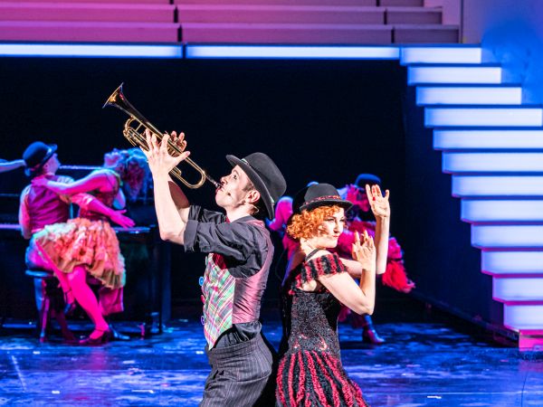 Stefan Huber inszeniert Funny Girl als große Broadway-Show mit einer großen beleuchteten Show-Treppe, die sich variabel in verschiedene andere Räume verwandeln kann (Bühnenbild: Harald B. Thor). Insgesamt scheint Funny Girl in vielen Dingen aus heutiger Sicht sehr aus der Zeit gefallen zu sein, aber gerade dies macht auch den Charme der Inszenierung aus. Selbstredend ist das hier vermittelte Frauenbild in vielen Dingen überholt und auch die große Revuenummer „Rat-Tat-Tat-Tat“ entstammt der großen Broadwayshow zu Zeiten des ersten Weltkrieges, durch die das Publikum und die „tapferen amerikanischen Soldaten“ patriotisch bei Laune gehalten werden sollten. Da es hier aber um eine historische Geschichte geht und dies auch genauso inszeniert wird, wäre es vermessen, immer alles an heute geltenden Maßstäben messen zu wollen. Dann würde nicht nur dieses Werk, sondern viele andere Stücke ebenso schnell in der totalen Versenkung verschwinden, was absolut tragisch wäre. Das Ensemble trumpf nicht nur beim erwähnten „Rat-Tat-Tat-Tat“ immer wieder in großen Choreografien von Danny Costello (Einstudierung: Sabrina Stein) auf. Hinzu kommen die sehr aufwendigen Kostüme von Susanne Hubrich, die den Zuschauer auf die Zeitreise in die Vergangenheit mitnehmen. Alles wirkt im positiven Sinne wunderbar altmodisch. Dies gilt auch für die Kompositionen, mal geht es voller Swing mit Tempo voran, dann sind es die leisen Momente, die besonders berühren. Hier gelingt Christoph Wohlleben ein besonders präzises Dirigat. Der Klang des 24köpfigen Orchesters ist absolut beeindruckend. Mit Katharine Mehrling hat man eine Besetzung der Fanny Brice gefunden, die mit unglaublicher Bühnenpräsenz, großartigem Gesang und feinem Humor die Titelrolle absolut treffend verkörpert. Ihr zur Seite stehen die beiden erfahrenen Musicaldarsteller Alen Hodzovic als Nick Arnstein und Marc Seitz als Eddie Ryan. Bleibenden Eindruck hinterlassen auch Marianne Larsen als Fannys Mutter, Sylvia Wintergrün als neugierige Mrs. Strakosh und der wunderbare Heinrich Schafmeister als Florenz Ziegfeld. Insgesamt stehen bei dieser großen Produktion 27 Darsteller auf der Bühne der Stiftsruine, die für drei Stunden feinste (historische) Musicalunterhaltung sorgen.