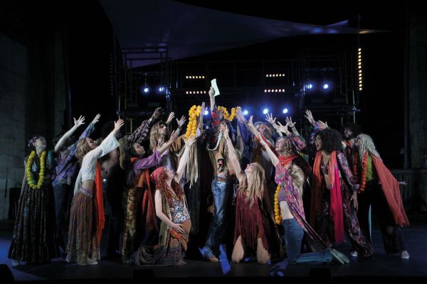 Der guten Stimmung des Publikums steht dies allerdings nicht entgegen, im Gegenteil. Zum Ende gibt es einen orkanartigen Applaus für das gesamte Ensemble, welches in der Tat ganz hervorragende Arbeit leistet. Stellvertretend für die insgesamt 26köpfige Besetzung seien hier auf Grund einiger größerer Solostücke nur Bettina Mönch als Sheila, Merlin Fargel als Berger, Christof Messner als Claude und Martina Lechner als Jeanie genannt. Besonders die großen Ensemble-Nummer wissen besonders zu gefallen. In Bad Hersfeld werden die Songs in englischer Sprache präsentiert, „weil die Songs eher Haltungen beschreiben und weniger die Handlung vorantreiben“, begründet Gil Mehmert diese Entscheidung. Dies ist auch für das gewünschte Konzertfeeling die richtige Entscheidung. Das übriggebliebene Grundgerüst der Handlung wird dagegen auf Deutsch vorgetragen. Bei den erwähnten Ensemble-Nummer wie den bekannten „Aquarius“, „Hair“ oder „Let the sunshine in“ kommen auch die Choreografien von Melissa King besonders zur Geltung. Die Band der Bad Hersfelder Festspiele unter der musikalischen Leitung von Christoph Wohlleben liefert ebenfalls eine tadellose Leistung ab.