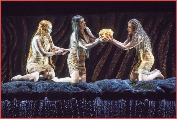 Diese Vorgehensweise ist sehr überzeugend, kann aber nur aufgehen, wenn das Werk, wie hier, als Einzelstück inszeniert wird. Zeigte nur ein einziger Regisseur für den gesamten „Ring“ verantwortlich, müsste diese Konzeption scheitern, bei dem nur für den Vorabend verantwortlichen Hermann geht sie indes vortrefflich auf. Man möchte sie unter all den vielen Interpretationen des Vorabends der Tetralogie nicht missen. Hier haben wir es auch szenisch mit einer gelungenen Rechtfertigung dafür zu tun, den „Ring“ vier Teams anzuvertrauen. Hermann will seine Regiearbeit als Wahrnehmungsexperiment verstanden wissen, das in diesem Zusammenhang voll funktioniert. Das Ganze wird von ihm als Kreislauf angelegt. Zu Beginn bewacht Erda den Schlaf der vor einem schwarzen Lavafelsen schlummernden, märchenhaft schön eingekleideten Rheintöchter. Dann wirft sie den Mädchen den Ring zu. Wenn die Urmutter am Ende dann den Ring dem Rhein zurückgibt, schließt sich der Kreis. Hier weicht Hermann vom Schluss der „Götterdämmerung“ ab, in diesem konkreten Kontext mag der Einfall aber durchaus angehen. Insgesamt bietet der Regisseur viel Neues, einiges kommt einem aber schon bekannt vor. So z. B. dass der aus einem Feuerofen auftretende Loge als diabolischer Strippenzieher fungiert und dass Freia unter einem Stockholmsyndrom leidet. Das Liebesverhältnis, das sie wider den Text mit dem sympathischen Jung-Architekten Fasolt unterhält, spricht da eine eindeutige Sprache. Auf seinen Tod reagiert sie äußerst betroffen. Auch dass Alberich augenscheinlich etwas zu viel Testosteron sein Eigen nennt, hat man schon anderswo gesehen. Diese Aspekte fügen dem insgesamt überaus positiven Gesamteindruck der Inszenierung aber keinen Schaden zu.