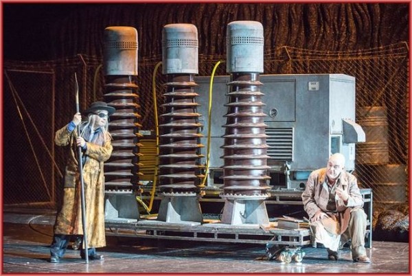 David Hermann ist in Zusammenarbeit mit Jo Schramm (Bühnenbild) und Bettina Walter (Kostüme) eine gut durchdachte, flüssige und spannende Inszenierung gelungen, die sich tief in das Gedächtnis eingrub. Indes sollte der geneigte Operngänger, der dieses „Rheingold“ besucht, auch die anderen drei Teile des „Ringes“ gut kennen, sonst läuft er Gefahr, nicht zu verstehen, was das Regieteam da so versiert auf die Bühne gebracht hat. Denn in Hermanns Deutung des Vorabends sind die drei anderen Teile des Zyklus bereits in nuce mit enthalten. Man könnte von einem Ring an einem Abend sprechen, der ist aber freilich nicht von Loriot. Es ist zudem das erklärte Anliegen des Regisseurs, Wagners ausgeprägte Leitmotivtechnik auch szenisch umzusetzen. Den musikalischen korrespondieren bildliche Leitmotive, die bereits in die Zukunft weisen und die Hermann mit Schauspielern temporeich in Szene setzt. Insgesamt ist seine Personenführung ausgefeilt und stringent.