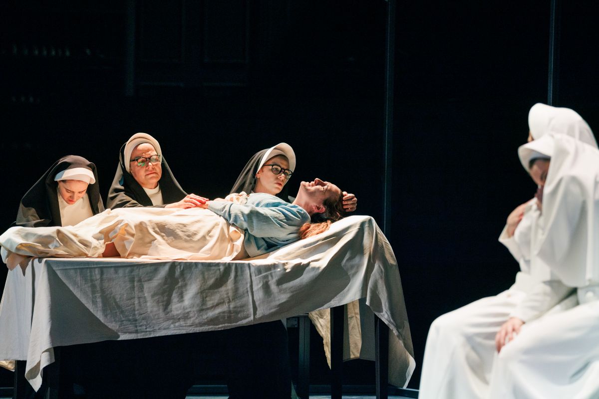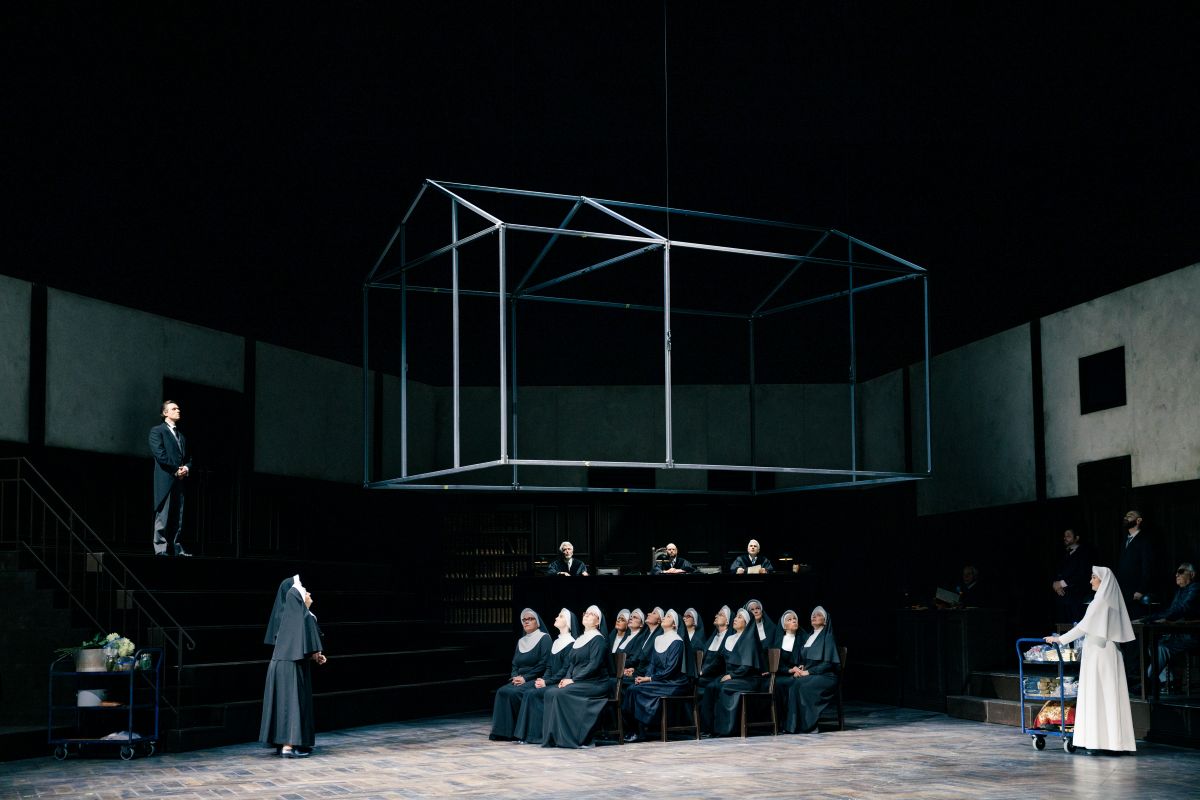 Die Französische Revolution ist irgendein anderer Krieg, der um diese Zeit tobte, aber gleichwohl das Ende der Karmeliterinnen bedeutete. Zentrales Element dieser Inszenierung ist ein Gerichtssaal. Eindringlich geht die Regisseurin der Frage nach, wie aus einem ursprünglichen Ort des Rechts unter der Diktatur der Jakobiner ein Ort des Unrechts und des Schreckens werden konnte, wo Verbrecher auf der Richterbank sitzen. Das war ein überzeugender Ansatzpunkt und in der Folge einprägsam umgesetzt. Den Karmeliterinnen ist eine Art hausartiges Metallgestänge zugeordnet. Hier sind die Nonnen nie ganz unter sich, sondern ständig den Blicken der fast durchgängig anwesenden Gerichtspersonen ausgesetzt. Einer Intimsphäre der Frauen erteilt Frau Schwalbach eine klare Absage. Sogar die alte Priorin Madame de Croissy stirbt gleichsam in der Öffentlichkeit. Dem Arzt fällt es gar nicht ein, ihr auf irgendeine Art zu helfen. Tatenlos sieht er ihrem grausamen Sterben zu. Schließlich wird die alte Priorin von einer Nonne mit einem Kissen erstickt. Diese Tat ist indes nicht als Mord zu werten, sondern als Sterbehilfe, um der Todgeweihten weitere qualvolle Leiden zu ersparen. Das war ein eindrucksvolles Bild. Mit Hilfe der häufig eingesetzten Drehbühne kann der Gerichtsaal in die verschiedensten Stellungen gebracht werden und ständig zwischen seinem Innen- und Außenbereich hin und her gewechselt werden. Das Ganze steht unter einem der Mottos der Französischen Revolution, nämlich Egalité, was in Deutsch Freiheit bedeutet. Dieses Wort wird immer wieder auf die Wände des Gerichtssaales projiziert. Angesichts der Tatsache, dass es hier keine Gleichheit gibt, wirkt es wie blanker Hohn.