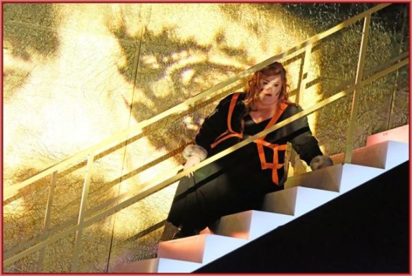 Zu Beginn des zweiten Aufzuges ist der Raum erweitert. Wotan und die anderen Götter erleben die Zeit kreisförmig. Dem Göttervater ist die Zukunft nicht verschlossen. Er sieht sein nahendes Ende voraus und lässt alle Hoffnung fahren. Ständig tritt er auf der Stelle und kommt nicht so recht weiter. Aus diesem Gedanken heraus hat das Regieteam das Bild der Rolltreppe vor einem goldenen Hintergrund entwickelt, auf dem Wotans Diskussion mit Fricka stattfindet. Wer gerade die Oberhand hat, steht oben. Die Göttin der Ehe wird hier nicht als böse Zicke vorgeführt, sondern als geschickt argumentierende Strategin. Im Zentrum des Interesses steht bei Sharon der große Monolog Wotans, den er auf ganz eigenwillige, so noch nie erlebte Weise deutet. Der Gott verlässt die Bühne und singt per Mikrophon aus dem Off, während sein Gesicht öfters in Großformat auf den Hintergrund projiziert wird. Auch die Konterfeis anderer „Ring“-Protagonisten und Erinnerungsstücke an das „Rheingold“ erscheinen immer wieder im Bild. Hier liegt der Fokus ganz auf einer von zahlreichen Videos dominierten Rückschau. Das war schon eine ungewöhnliche, aber durchaus Eindruck machende Vorgehensweise. Wenn die Rede des Gottes auf Siegmund kommt, tritt dieser in Anwendung eines Tschechow’schen Elementes selbst auf. In Vorausahnung seines Todes sticht ihm Wotan hier bereits seinen Speer in den Rücken.