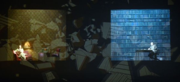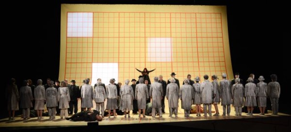 Starke Bläsersektion, (relativ) noch stärkere Schlagwerksgruppe und eine große Streicherformation; so könnte man in wenigen dürren Worten beschreiben, was sich da unter der Leitung des stellv. GMD Johannes Willig von der Badischen Staatskapelle im Graben versammelt hatte; auf die Orchesterstärke bezieht sich das nicht, was man als minimal music bezeichnet, deren Vertreter in der zweiten Generation der Komponist John Adams ist. Auch die reine Spielzeit des Werks von etwas über zweieinhalb Stunden ist alles andere als „minimal“, gerade für ein zeitgenössisches Werk. Einige Intonationsfehler und Unsauberkeiten im Graben waren zwar kaum überhörbar; aber insgesamt hinterließ der Orchesterpart doch einen prächtigen Eindruck. Überwiegend im ersten Teil waren die dramatischen Schlagwerk-Ostinati („patterns“ – eine Szene lang Gewitter!) angeordnet, deren Urgewalt sich hier und da auch im zweiten Teil Bahn brach. Dieser aber wurde mehr von raffiniert instrumentierten Klangteppichen beherrscht, von romantisierenden Tremoli der tiefen Streicher und deren spannungsgeladenen Crescendi. Unheilverkündend saßen darauf die Linien der tiefen Holzbläser, namentlich Kontrafagott und Bassklarinette. Das wurde sehr eindrücklich musiziert ebenso wie die vorwärtstreibenden Orchesterzwischenspiele des ersten Akts. Was man aus den Instrumenten im Graben nicht herausholen konnte, wurde zugespielt. Zuerst das unheimliche metallische Summen und Dröhnen elektronischer Musik, die das Unheil der Atomkraft kennzeichnen soll; visualisiert auf dem Millimeterpapier-Hauptvorhang der Bühne während der Ouvertüre als Oszillogramme in drei Ebenen, deren Zacken immer weiter ausschlagen, sich vermischten und beim Einsatz des Orchesters sich über die ganze Bühnenhöhe ausschlugen. Dann auch die diversen Klangeffekte des militärischen Alltagslebens. Präzise wirkte der Chor (Einstudierung: Ulrich Wagner) in lapidaren Einwürfen und Kommentaren in ganz engem Tonspektrum bleibend.