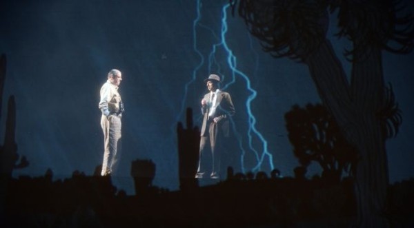 Am Badischen Staatstheater kam nun nach „Wallenberg“ und „Die Passagierin“ als drittes Werk in der Serie „politische Oper“ der Doctor Atomic von John Adams heraus. Als Teil einer Serie entstand auch dieses Auftragswerk der San Francisco Opera und wurde dort 2005 uraufgeführt. Denn wie schon in seinen vorangegangenen Opernkompositionen („Nixon in China“ und „Klinghoffers Tod“) hat sich der Komponist Adams ein Thema der Zeitgeschichte vorgenommen und sich dabei – soweit auf einer Opernbühne überhaupt möglich –an der historischen Realität orientiert. Dr. Atomic, das ist die Gestalt des Robert Oppenheimer, Sohn deutsch-jüdischer Emigranten, der in Göttingen bei Max Born promoviert hat und als „Vater der Atombombe“ gilt. Das Libretto für die Oper schuf Peter Sellars. Dabei handelt es sich um eine Collage aus historischen Dokumenten (Protokolle, Berichte, Korrespondenz) einerseits und von Oppenheimer geschätzter Lyrik andrerseits. Dieser Antagonismus aus banal wirkenden Textausrissen und tiefgründiger und rätselhafter Poesie (Baudelaire), der Spannung aus dem Text erzeugt, überträgt sich auch auf die Musik mit ihrem Gegensatz aus motorischem, heftigem Vorwärtstreiben mit den entsprechenden Schlagzeuggewittern und kontemplativen romantisierenden Passagen. Zudem sind die beiden Akte der Oper mit ihrem jeweils drei Szenen gegensätzlich angelegt: handlungsgetrieben der klar strukturierte erste, nach innen gekehrt der zweite Akt, der mit seiner unrealen Durchmischung der Handlungsorte zudem einen Hang zum Surrealen aufweist.