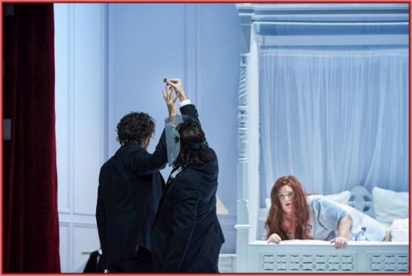 Nicht nur den verschiedenen Personen, die unter seiner Ägide durchweg eine sensationelle Zeichnung erfahren und öfters in Unterwäsche und Nachtgewand auftreten – das war schon zum Schmunzeln -, weist Kratzer essentielle Bedeutung zu. Auch dem Ross Grane schenkt er entschieden mehr Aufmerksamkeit als die meisten seiner Regiekollegen. Im ersten Aufzug sieht man Siegfried und Brünnhilde nur die Zügel halten. Zu Beginn des zweiten Aufzuges erblickt man ein echtes Pferd auf der Bühne. Am Ende dieses Aktes wird ein künstlicher Pferdekadaver auf die Bühne gebracht, dem die hasserfüllte Brünnhilde dann auch gleich die blutigen Eingeweide herausreißt. Zum Schluss sieht man erneut nur die Zügel Granes. Klug war die Interpretation von Hagens Zaubertrank. Er weist überhaupt keine Magie auf, sondern besteht aus reinem Alkohol. Siegfried verträgt ihn nicht und bricht nach seinem Genuss zusammen. Am Ende erweist sich die große Meisterschaft Kratzers aufs Neue. Dem großen Weltenbrand erteilt er eine klare Absage. Ihm genügt ein winziges Lagerfeuer, in dem Brünnhilde die „Götterdämmerung“-Partitur verbrennt. Sie will als Regisseurin den Ausgang des Stückes selbst bestimmen und lässt sich von den drei Regisseuren nichts mehr sagen. Mit dem Ring in der Hand spult sie die Zeit zurück. Es kommt zu einer Auferstehung der Toten – neu war, dass sich Hagen und Gutrune gegenseitig mit einem Messer umbringen – und alles strebt wieder dem Anfang zu. Brünnhilde kehrt in ihr Boudoir zurück, in dem sie erneut auf den zu neuen Taten aufbrechenden Siegfried trifft. Das war alles sehr überzeugend und in geradezu preisverdächtiger Weise umgesetzt. Bravo!