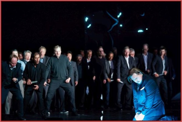 Kratzer ist, wie gesagt, nur ein Regisseur unter vieren. Und genau das bringt er auch auf die Bühne. Zu Beginn sieht man die drei Regisseure der vergangenen Abende auf ihren Regiestühlen mit dem Rücken zum Publikum vor einem Zwischenvorhang mit der Aufschrift „The end“ schlummern. Nacheinander erwachen sie und beginnen mit Frauenstimmen zu singen. Es sind die Nornen, die sich hier in Kostüm und Maske der drei Regisseure präsentieren und dabei individuell charakterisiert werden. David Hermann, der im „Rheingold“ die anderen Teile des Zyklus szenisch vorwegnahm, sind von Kratzer die vier „Ring“-Partituren zugeordnet, Yuval Sharon erscheint mit Tablet und Videokamera und Thorleifur Örn Arnasson benötigt zum Inszenieren nur ein Reclam-Heft. Die Nornen im Gewand der drei Regisseure werden hier zu den eigentlichen Hauptrollen. Sie erfahren bei Kratzer eine ungemeine Aufwertung. Er weist ihnen nicht nur eine erzählende, passive Funktion zu, wie es in anderen Inszenierungen des Stückes immer der Fall ist, sondern eine durchaus aktive. Immer wieder geistern sie über die Bühne und versuchen den von ihnen erkannten Untergang abzuwenden. Dazu schlüpfen sie in die verschiedensten Rollen. Im dritten Aufzug erscheinen sie im Gewand der Rheintöchter mit Nixenschwänzen, die Siegfried anhand der Partitur klar machen, dass Wagner seinen Tod fordert. Und im ersten Aufzug verkleidet sich die erste Norn alias David Hermann als Waltraute, um in dieser Maske Brünnhilde dazu zu bewegen, den Ring zurückzugeben. Im zweiten Aufzug übernehmen die Nornen darüber hinaus auch die wenigen Sätze der Chorfrauen. Ihren Bemühungen ist indes kein Erfolg beschieden. Sie können das Schicksal nicht aufhalten. Darin liegt ihre Tragik. Dieser Handlungsstrang wird von Kratzer konsequent durchgezogen und erlahmt nie. Deutlich wird, dass der Regisseur mit Tschechow´schen Elementen trefflich umgehen kann.