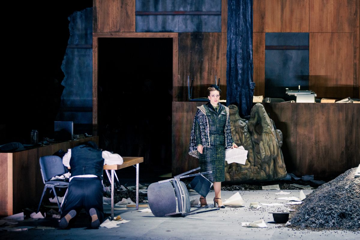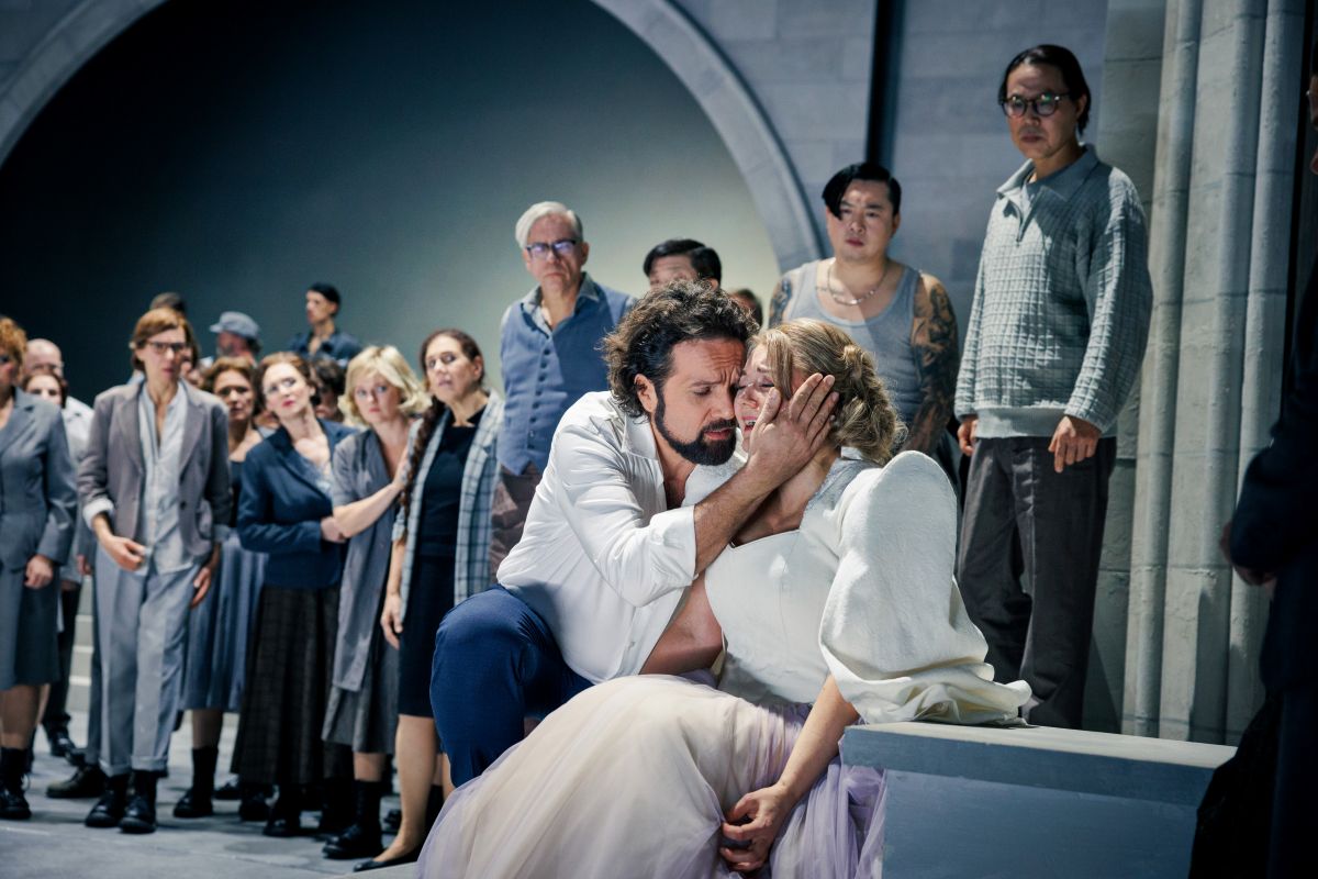 Zu Beginn erblickt man die Projektion eines Textes aus Wagners 1849 entstandener Schrift Die Revolution: Das Heilige ist allein der freie Mensch, und nichts Höheres ist denn er. Vernichtet sei der Wahn, der einem Gewalt gibt über Millionen… Bereits hier, ganz am Anfang, wird die politische Doktrin, die der Regisseur dem Ganzen angedeihen lässt, deutlich. Nachhaltig schlägt er eine Brücke von der Wagner-Ära zur Gegenwart. Wenn sich der Vorhang öffnet, erschließt sich dem Blick ein durch Krieg zerstörtes Parlaments-Gebäude mit einer Hans Kindermanns Adler-Relief nachempfundenen Adler-Plastik, in dem der für eine Führungsposition eigentlich ungeeignete, alte und schwache König Heinrich Werbung für seinen Ungarn-Feldzug macht und Ortrud und Telramund einen Staatsstreich vorbereiten.