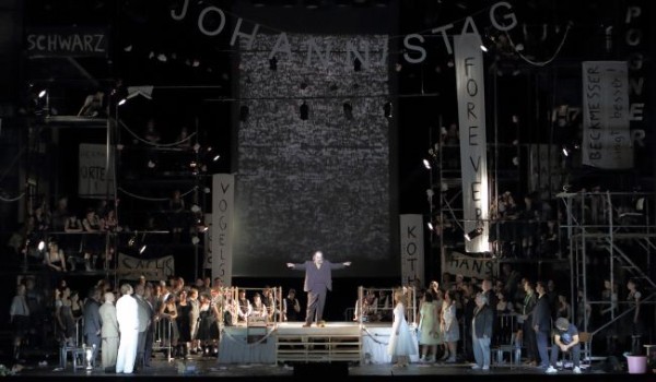 Gleich darauf tritt Stolzing auf den Plan, der von der Regie so ganz anders gezeichnet wird als es sich der traditionelle Opernbesucher vielleicht vorstellt. Mit T-Shirt, Lederjacke und Gitarre bewehrt mutet er wie ein vorweggenommener Alt-68er an. Als die vorbeilaufende rothaarige und von Meentje Nielsen mit einem Petticoat ausgestatte Eva ihr Schultertuch verliert, nutzt er diesen Anlass geschickt, um mit ihr in Kontakt zu treten, und hänselt sie dabei ein wenig. Zu etwas intimeren Annäherungen zieht sich das Paar dann in den Wagen eines Bierlieferanten mit der Aufschrift „Meister-Bräu“ zurück. Überhaupt wird Bier in diesem Nürnberg augenscheinlich sehr gerne getrunken. Eine mobile Schusterwerkstatt, nicht etwa mit Nürnberger, sondern mit Münchner Kennzeichen, nennt auch Hans Sachs sein Eigen, während es der einen weißen Leinenanzug tragende Pogner bereits zu einem Luxus-BMW gebracht hat. Der einen grauen Anzug tragende David fährt auf einem kleinen Moped vor, das sich später Eva zueignet, um mit Stolzing zu fliehen. Die anderen Lehrbuben sind ebenfalls grau gewandet, tragen aber kurze Hosen. Unter ihnen sind auch Frauen in Kleidern. Sachs’ Lehrbube weiht den Ritter anhand von in Aktenordnern verwahrten Unterlagen in die Geheimnisse des Meistergesangs ein, während er eine Wagner-Büste mit Poliermittel säubert. Die Arbeit hätte er sich indes sparen können, denn am Ende des ersten Aufzuges wird der Wagner-Kopf von dem wütenden Stolzing gnadenlos zertrümmert. Respekt vor dem großen Meister hat der Ritter wahrlich nicht. Und auch der von zahlreichen Schnäpsen berauschte David zeigt davon keine Spur, wenn er sich auf der Festwiese in den Pokal der Meistersinger übergibt.