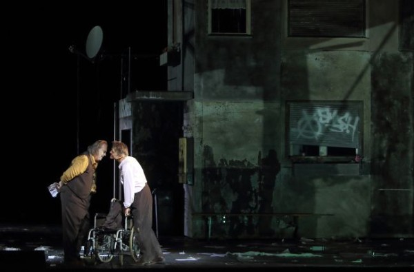 Während der Prügelfuge wird Beckmesser schlimm gebeutelt. Allgemein wird in dieser Szene das starke Aggressionspotential der mit Baseballschlägern aufziehenden Nürnberger Bevölkerung mehr als deutlich. Auch dem als Polizisten auftretenden Nachtwächter wird wenig Respekt gezollt. Einige Bürger mit Affengesichtern weisen ihn rigoros in seine Schranken. Ja, gegenüber Gesetz und Ordnung ist man hier nicht gerade aufgeschlossen. Spätestens in dieser Szene wird deutlich, dass wir es hier eben nicht nur mit einer Komödie, sondern in gleichem Maße mit einer Tragödie zu tun haben. Dieser Aspekt erweist sich in all seiner Schärfe auch am Ende des Stücks: Stolzing hat überhaupt kein Interesse daran, ein Meistersinger zu werden, und verlässt mit Eva schnurstracks die Bühne. Sachs Ansprache „Verachtet mir die Meister nicht“ geht ins Leere. Dem auf der ganzen Linie Schiffbruch erleidenden Schusterpoeten bleibt nur noch, sich eine Zigarette anzuzünden und einer ungewissen Zukunft entgegenzusehen. Zu den Schlusstakten erscheint noch einmal Beckmesser und richtet eine Pistole gegen Sachs. Dann überlegt er es sich jedoch anders und erschießt sich selbst – ein ebenso tragisches wie unvorhergesehenes Ende. Insgesamt ist zu konstatieren, dass der Regisseur die Biographie der Figuren konsequent zu Ende gedacht hat. Von einer Komödie ist nun nichts mehr zu spüren. Das Ende mündet vielmehr in eine Katastrophe. Die meisten Figuren sind gescheitert. Das Scheitern steht auch im Mittelpunkt von Böschs Interpretation. Die Frage, ob unter diesen Umständen eine Neudefinition alter Werte überhaupt noch möglich ist, wird nicht beantwortet. Was künftig aus Nürnberg werden wird, bleibt offen und seine Zukunft ungewiss. Das alles hat Bösch mit Hilfe einer flüssigen, stringenten Personenregie eindringlich umgesetzt.