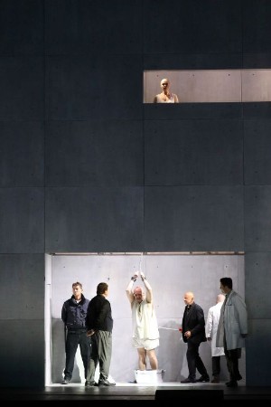 Die Aufführung zeigte einmal mehr mit aller Deutlichkeit, wie wichtig ein Ineinanderfließen von Szene und Musik ist, um einen beeindruckenden Musiktheaterabend zu generieren. Die musikalische Verantwortung lag dabei in den Händen von Vladimir Jurowski, der seit der Saison 2021/22 die Position des GMD der Bayerischen Staatsoper innehat. Er sorgte zusammen mit dem Riesenapparat des Bayerischen Staatsorchesters für eine beeindruckende Wiedergabe der flächigen, vertikal komponierten Partitur Pendereckis. Trotz des Riesenapparates, den Penderecki für dieses Werk vorschrieb, wurde es praktisch nie laut und schon gar nie ZU laut. Das Klangbild blieb stets transparent, nicht einmal die vielen Cluster führten zur Ermüdung der Ohren. Man war von der Musik fasziniert, der Klang war magisch in den Bann ziehend – und an gewissen Stellen auch abstoßend. Die zwei pausenlosen Stunden vergingen jedenfalls wie im Flug. Daran hatte (natürlich auch neben der exzellenten Sängerschaft) die Inszenierung von Simon Stone ihren verdienten Anteil: Der Bühnengestalter Bob Cousins hatte für die 30 (zum Teil nur 40 Sekunden dauernden) Szenen eine kongeniale Lösung gefunden. Ein gigantischer weisser Kubus stand auf der Drehbühne, der durch einen klugen Einfall gar fünf Seitenflächen aufwies. Jede der Flächen wies andere geometrische Einschnitte auf, die Kapelle, Zelle, Folterraum, Treppenhaus, Kirchenraum, Beichtstuhl oder Schlafzimmer darstellten. Durch die Drehung wurden die häufigen Szenenwechsel fließend und organisch ermöglicht. Simon Stone nun erfüllte die abstrakt-konkrete Bühnenkonstruktion mit deutlicher, auch – wo angebracht – drastischer Interaktion. So wurde die Handlung deutlich, spannend, intensiv, ja atemberaubend und die Charaktere erhielten klare Konturen (welche ein Unterschied zu LES TROYENS am Abend zuvor).