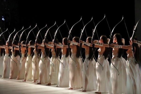 Etwas seltsam ging es bereits im ersten Aufzug zu. Wesensmerkmal dieses Aktes ist hier ein Kreis, in dem man zu Beginn ein Auge erblickt. Man kann durchaus auf den Gedanken kommen, dass es das allsehende göttliche Auge ist. Dies dürfte indes nicht zutreffen. Hier handelt es sich eher um das Weltenauge, auf das eine Schar barbusiger weiblicher Bogenschützen eine Vielzahl von Pfeilen abschießt. Die Bedeutung dieses Bildes ergibt sich in Zusammenschau mit einer späteren Idee Castelluccis. Er lässt die Minnesänger mit Pfeil und Bogen auftreten. Es besteht eine Wesensverwandtschaft zwischen der Harfe, dem Instrument der Sänger, und dem Bogen. Im Programmbuch ist zu lesen, dass der Jagdbogen aufgrund der strukturellen Ähnlichkeit ein Prototyp der Harfe war. Diesen Zusammenhag beleuchtet der Regisseur eindringlich. Daraus leitet sich auch sein Einfall her, die Minnesänger im ersten Aufzug als Jagdgesellschaft auftreten zu lassen. Sie tragen rote Mäntel und schwarze Gesichtsmasken und wirken recht anonym. Nur Wolfram tritt ohne Maske auf und ist konsequenterweise der Anonymität enthoben. Im Tal vor der Wartburg schwebt ein goldener Schild vom Schnürboden herab, den man als Sonne interpretieren kann. Was der goldene Stein, den die Pilger mit sich führen, bedeuten soll, bleibt dagegen unklar.