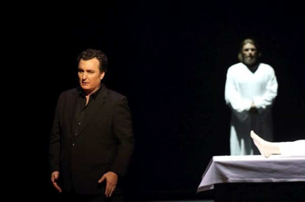Zufrieden sein konnte man mit dem dritten Aufzug, in dem die Ewigkeit thematisiert wird. In diesem Akt sind die Vorhänge aus dem zweiten Aufzug hochgezogen. Der untere Teil der Bühne ist in Dunkel getaucht, in der Luft steht ein Pfeil still. Durch Projektionen wird der rasend schnelle Verlauf der Zeit von einer Sekunde bis hin zu Milliarden von Jahren versinnbildlicht. Das Bühnenbild prägen hier zwei Grabmäler, auf die die Vornamen Klaus und Emma der Sänger von Tannhäuser und Elisabeth eingraviert sind. Im Folgenden werden Tannhäuser und Elisabeth Zeugen ihres eigenen Ablebens. Castellucci zeigt nun sieben Verwesungsphasen ihrer leblosen Körper auf. Statisten tauschen immer wieder Skulpturen der toten Leiber aus. Zu guter Letzt sind die Körper Skelette. Nur der Staub der Liebenden vereinigt sich am Ende des Aktes. Hier haben wir es mit einer guten Symbolik zu tun. Elisabeth hat währenddessen stets am rechten Rand der Bühne gesessen. Am Ende erhebt sie sich und kniet gleichzeitig mit dem sterbenden Tannhäuser nieder. Jetzt können die beiden in den seligen Frieden eingehen, von dem der Pilgerchor kündet.