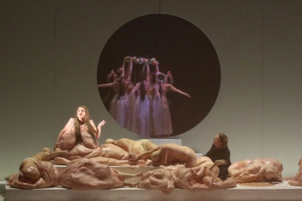 Nicht zu gefallen vermochte Castelluccis Deutung des Venusberges, dem jede Erotik abging. Er besteht aus einem Haufen Fleisch und nackter unförmiger Haut, auf dem eine grauenerregende Venus thront. Dass es Tannhäuser unter diesen Umständen zuviel wird, ist verständlich. Auch wenn der Regisseur sich sicher dabei etwas gedacht hat: Dieses Bild ist einfach nur hässlich und abscheulich. Im von einer Reihe beweglicher Vorhänge geprägten zweiten Aufzug, in dem der Raum gleichsam zum Mitspieler wird, kommt dem erotischen Faktor dagegen große Bedeutung zu. Hier ist es Elisabeth, die recht sexy wirkt. Über ihrem eleganten weißen Kleid trägt sie ein anscheinend transparentes Gewand, durch das ihr nackter Körper durchzuschimmern scheint. Dieser ist aber nur auf dieses zusätzliche Kleid aufgemalt. Das wird spätestens dann deutlich, wenn Elisabeth kurz vor dem Ende des Sängerwettstreits dieses nur scheinbar transparente Obergewand ablegt, das Tannhäuser zu seinem Lobgesang auf Venus dann an sich reißt. Das war ein gelungener Regieeinfall. Nicht nachzuvollziehen war dagegen, dass Elisabeth dem größten Teil des Sängerwettstreits nicht beiwohnt und einfach von der Bühne geht. Die mit Nacktkostümen ausgestatteten Bewegungsstatisten, die sich unter die ein Kollektiv bildenden Gäste mischen, machen deutlich, dass die Wartburggesellschaft bereits vom Venusberg infiltriert ist. So weit so gut. Das kann man so machen. Fraglich war andererseits, warum sich zu Beginn des Sängerkrieges alle Zuhörer auf den Boden legen und nur der singende Wolfram stehen bleibt.