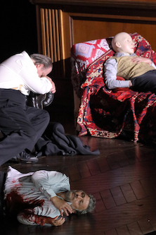 Später lag dann die männliche Puppe statt Tristan auf der Chaise longue neben Kurwenal, dessen Entsetzen angesichts der Leiden seines Herrn gar nicht mehr zu verstehen waren. Denn dieser saß derweil an einem Tisch wie beim letzten Abendmahl mit etwa zehn Puppen und sang erstmal von dort aus seine Fieberphantasien im 3. Aufzug, die ihm auch schon mal ein Klettern über die Tischplatte abverlangten… Hinzu kamen wirklich überflüssige, nun auch schon wieder zu postmodernen Stereotypen verkommene Statisten in weißer Unterwäsche, ein immer häufiger zu sehender neuer Opern-Fetisch.