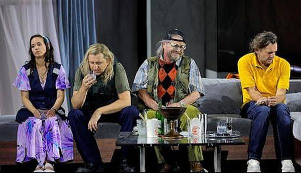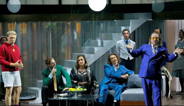 Nachhaltig zeigt Andrea Cozzi unterschiedliche Räume innerhalb des Herrenhauses der Unternehmerdynastie Wotan auf. Es ist eine recht bunte Menschenmischung, die hier wohnt. Fricka ist die Frau des Clan-Führers und Freia die Tochter. Loge wird von der Regie als ein ganz ausgekochter, in gutbürgerlichem Anzug, aber mit fettigen Haaren daherkommender Winkeladvokat vorgeführt, der in jeder noch so verzwickten Lage Rat weiß. Donner schlägt bei Schwarz nicht mit einem Hammer um sich, sondern benutzt einen Golfschläger. Beim Gewitterzauber fährt es ihm dabei einmal ganz schön ins Kreuz – ein heiterer Augenblick. Auf der linken Seite der Bühne befindet sich eine Garage, in der die beiden jungen, nicht unsympathisch wirkenden Bauunternehmer Fasolt und Fafner ihre Luxuslimousine parken. Auf der Kühlerhaube derselbigen wird Fafner am Ende seinen Bruder ermorden.