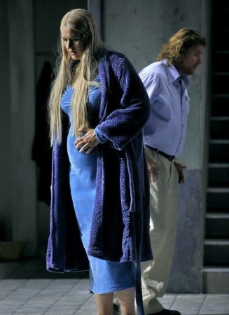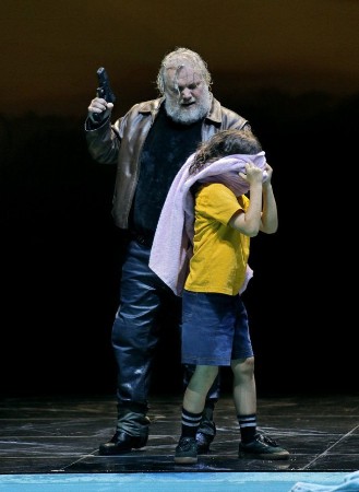 Und wie ist zu erklären, dass Sieglinde bei Einfall Siegmunds in Hundings Hütte schon hochschwanger ist (siehe Bild rechts!) und auf dem Weg zum Brünhilden-Felsen entbindet, nachdem Wotan sie kurz vor dem Kampf Ende des 2. Aufzugs entweder noch schnell vergewaltigen wollte oder um das Kind, bevor sein eigener Inzest an der Tochter auffällt, zur Welt zu bringen – eine noch zu beantwortende Frage. Oder ist gar Hunding der Vater?! Jedenfalls wird Sieglinde das Baby statt der Schwertstücke überreicht, und sie fasst sich beim „hehrsten Wunder“ dennoch an den Bauch. Zu beantworten wäre auch die Frage, wer in dem Sarg liegt, der zu Beginn des 2. Aufzugs der Walküre beweint wird. In Analogie der Vorwegnahme von Entwicklungen – aus welchem unerfindlichen Grunde auch immer – von Valentin Schwarz könnte das wohl nur Siegmund sein. Diesem schießt Wotan aus einem Meter Entfernung in den Kopf, ein Tiefpunkt des ständigen Herumfuchtelns mit Pistolen fast aller Protagonisten in „Rheingold“ und „Walküre“. Es ist müßig, noch weitere solcher „Begebenheiten“ aufzuzählen. Vielleicht ist noch interessant, dass der Feuerzauber mit einer Kerze und zwei Glas Rotwein absolviert wird, Wotan das von Fricka gereichte aber auskippt… Noch nie hat mich ein „Ring“ emotional so kalt gelassen wie dieser.