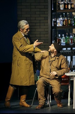 Dann geht es aber gleich hinein in die auch nach der Döner-Bude der „Götterdämmerung“ von Frank Castorf kaum noch überraschende Kneipe in Sandvike, in der sich Daland mit den norwegischen Matrosen auf den immer beliebter werdenden Plastikstühlen, die man in vielen Arztpraxen sieht, bereits beim Bier vergnügt und der Holländer in weißen Tennisschuhen von Beginn an als stummer Gast mit am Tisch sitzt. Denn er war nach der Idee des Regisseurs nach vielen Jahren zurückgekehrt, um Rache für die Misshandlung seiner Mutter zu nehmen. Krachend bricht der wackelige Campingtisch des Steuermanns bei dessen ohne Lärmbelästigung durchaus gut klingenden Lieds zusammen. Der Holländer steckt sich eine Zigarette an, nachdem er den Wirt – der übrigens verblüffend Frank Castorf gleicht – gebeten hat, den fünf Männern am Tisch eine Runde Bier auf seine Kosten auszugeben, als Ersatz für das (nur noch musikalisch wahrnehmbare) Eintreffen des Holländerschiffs.