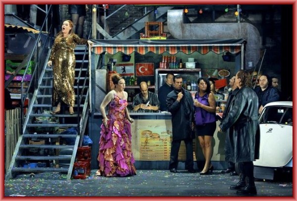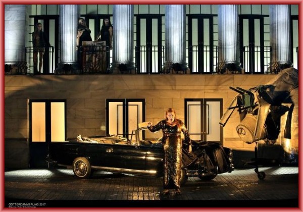 Wie schon im „Siegfried“ setzt Castorf auch hier erneut auf die Aufbereitung der DDR-Geschichte. Zusammen mit Aleksandar Denic (Bühnenbild) und Adriana Braga Peretzki (Kostüme) hat er das dramatische Geschehen im geteilten Berlin der 1980er Jahre vor der Wiedervereinigung angesiedelt. Der Alexanderplatz spielt in der „Götterdämmerung“ indes keine Rolle mehr. Das Ganze findet in einem Hinterhof in Kreuzberg statt, in dem man noch einen Teil der Berliner Mauer erblicken kann. Des Weiteren erschließt sich dem Blick die von S. Berthmann stammende Leuchtreklame des Kombinats VEB Chemische Werke „Plaste und Elaste aus Schkopau“. Hierbei handelt es sich um einen Slogan der ehemaligen DDR, der inzwischen Kultstatus genießt. Außerdem ist eine offenbar Sergej Eisensteins berühmtem Film „Panzerkreuzer Potemkin“ entsprungene riesige Freitreppe zu sehen. Diese Annahme findet ihre Bestätigung, wenn der bereits aus den vorangegangenen drei Inszenierungen bekannte, von Dramaturg und Regieassistent Patric Seibert dargestellte Allround-Statist einen mit Kartoffeln gefüllten Kinderwagen die Treppe hinabfährt. Später täuscht er böse die Rheintöchter. Blutüberschmiert stellt er sich tot und wird von ihnen kurzerhand in den Kofferraum ihres eleganten Mercedes-Cabriolets verfrachtet.