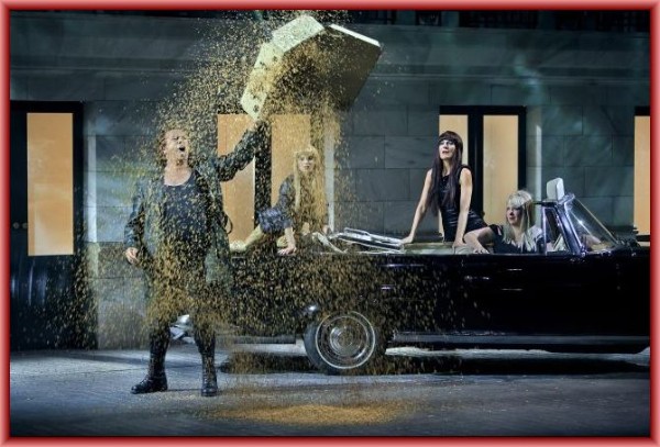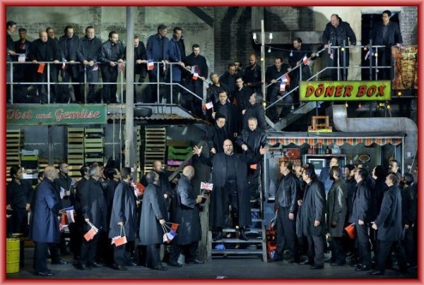 Der Schluss zeigt eine kritische finanzpolitische Aussage auf. Wenn man während der gesamten Aufführung davon ausgegangen war, das im Hintergrund aufragende, augenscheinlich von Christo verhüllte Gebäude würde den Berliner Reichstag darstellen, sah man sich getäuscht. Im dritten Aufzug fällt die Verhüllung schließlich und der gedachte deutsche Parlamentsitz entpuppt sich als die New Yorker Börse. Der Sinn dieses Regieeinfalles ist klar: New Yorker Wirtschaftsmagnate bestimmen die deutsche Finanzpolitik und nicht die Regierung der BRD. Castorf spricht dem deutschen Bundestag jegliche Relevanz ab und schiebt den amerikanischen Bankiers die Verantwortung für die herrschende Finanzkrise zu. Klug, aber auch ironisch spinnt er Wieland Wagners berühmtes Postulat „Walhall ist Wallstreet“ weiter. Die Teilung Berlins nach dem Krieg in vier Besatzungszonen wird dadurch versinnbildlicht, dass die Mannen im zweiten Aufzug kleine Fähnchen der vier Siegermächte schwingen. Hier wird im großen Rahmen Weltpolitik betrieben, die auch das Ende prägt. Die Utopie eines Weltuntergangs mit oder ohne Erlösung wird dem Zuschauer von Castorf verweigert. Viele zuvor aufgeworfene Fragen bleiben ungelöst im Raum stehen. Der von ihm angestimmte Schwanengesang auf Theorie und Praxis eines ursprünglich auf Identitätsfindung ausgerichteten, im Jahre 1989 indes auf halber Strecke zum Erliegen gekommenen DDR-Sozialismus lässt hier keine Quintessenz erkennen. Sich diese zurechtzulegen, bleibt dem Auditorium überlassen. Das war alles sehr ansprechend und von Castorf stringent umgesetzt.
