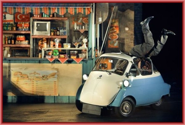 Die Gibichungen sind Inhaber einer Döner-Box, die neben einem einfachen Obst- und Gemüsestand errichtet ist. Diese nicht gerade königlich anmutende Sippe wird vom Regisseur mit westlichen Geschäftemachern identifiziert. Castorf stellt sie als Verbrecherbande dar, die problemlos zwischen Ost- und West-Berlin hin und her pendeln kann. Das gilt insbesondere für Hagen. Obwohl Gunther und Gutrune in dieser Inszenierung eine Aufwertung erfahren, wird offenkundig, dass sie keine Zukunft haben. Gunther ist alles andere als der konventionelle feige Schwächling und Gutrune eine selbstbewusste, starke und viele Facetten aufweisende junge Frau. Sie kann es kaum erwarten, ihr Geschenk auspacken zu dürfen, das sie von Hagen als Belohnung für ihre Bereitschaft erhält, an der gegen Siegfried geschmiedeten Intrige zu partizipieren. Als die Verpackung endlich fällt, sieht man eine schnuggelige Isetta, in die Gutrune auch sogleich einsteigt. Da hat ihr Hagen, der dem Hells Angel Frank Hanebuth nachempfunden ist, wahrlich eine große Freude bereitet.