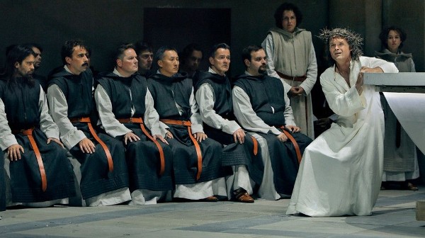 Zu Herzen geht auch, wenn die Gralsritter – im phantastischen Chor unübertroffen präzise, drängend und aggressiv – den geplagten Amfortas anzapfen, ja ihn sakral ausmelken. Ryan McKinny stöhnt so authentisch leidend, wenn ihm das Messer in die Seitenwunde gestoßen wird, daß man ihm tiefsten Schmerz abnimmt. Das Bild des nahezu ausblutenden Christus/Gralskönigs macht deutlich, wie die mittelalterlichen Darstellungen von Jesus als Schmerzensmann auf die Gläubigen gewirkt haben mögen. Das ist kein inflationäres Blutvergießen, man empfindet Fremdschämen für die blutgierige Gemeinschaft. Und eben aufrichtiges Mitleid mit Amfortas. Laufenberg wäre so oberflächlich, wie ihm mitunter vorgeworfen wurde, wenn er die von Klingsor als „Rittergezücht“ beschimpfte Versammlung allein unsympathisch und oberflächlich dargestellt hätte. „Jesus ‚runter vom Kreuz und wieder ‚ran ans Kreuz“ – so einfach ist das nicht. Die mönchischen Krieger nehmen Christus leiblich ernst und wickeln die Figur wie einen Leichnam vorsichtig in ein Laken – angebetet wird anschließend durch das Kreuz als Symbol das, was über den Gekreuzigten hinausgeht.
