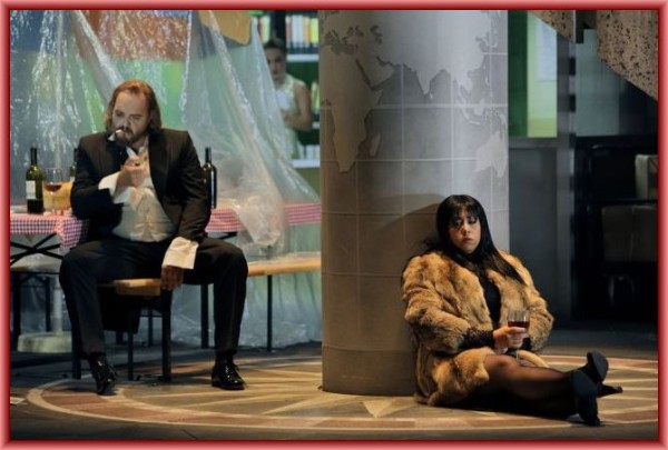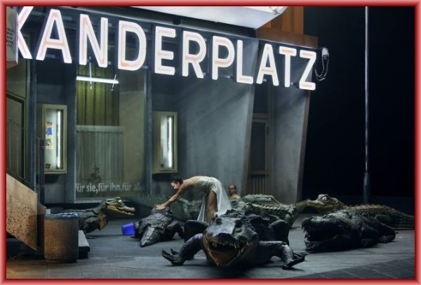 Diese versteht der Regisseur als gleichsam dem Friedrichspalast entsprungene, schillernd bunt gekleidete Revue-Tänzerin. Obendrein arbeitet sie als Prostituiere im Bordell der Edel-Puffmutter Erda, der sie während des Vorspiels zum dritten Aufzug beim Aussuchen der passenden Perücke für ihr Rendezvous mit Wotan in einem italienischen Restaurant hilft. Am Ende seiner Aussprache mit der Ur-Wala wird der Gott zum Zechpreller – ein köstlicher Regieeinfall. Kindlich einfältig nähern sich Siegfried und die Waldvogel-Frau einander an. Hier haben wir es mit zwei einsamen jungen Menschen zu tun, die übermütig durch eine Pfütze patschen und sich mit Wasser bespritzen. Zu guter letzt haben sie sogar noch Sex miteinander. Psychologisch gesehen ist diese Idee zwar durchaus nachvollziehbar, mit Blick auf die Dramaturgie der Schlussszene des dritten Aufzuges vermag sie aber nicht zu überzeugen. Diese wird praktisch ad absurdum geführt, wenn Siegfried bereits vor Brünnhilde eine Frau zu sehen bekommt und sogar mit ihr schläft. Ebenfalls nicht logisch ist, warum er vor dem Sex mit der ehemaligen Walküre Furcht verspürt, vor dem mit der Vogel-Maid aber nicht. Auf der anderen Seite wirkt das psychologische Verfahren, mit dem Castorf die Angst des neuen hohen Paares vor der geschlechtlichen Vereinigung aufzeigt, recht gelungen. Auf den ersten Blick mutet die in den letzten Minuten des Musikdramas hereinkriechende große Krokodilfamilie – fünf große und zwei kleine Krokodile – absurd und grotesk an. Verständlich wird dieses Bild erst, wenn man es von der psychologischen Warte aus betrachtet. Krokodile stellen nach Sigmund Freud die Angst des Menschen vor seinem erwachenden Geschlechtstrieb dar. Und genau das ist ja das Thema dieser vergnüglichen Szene. Erheiternd ist auch das Bild, in dem Brünnhilde einem der Krokodile mit einem Sonnenschirm im wahrsten Sinn des Wortes das Maul stopft. Das Siegfried folgende Waldvogel-Mädchen wird von diesem im letzten Augenblick aus dem Rachen eines der gefährlichen Tiere gerettet. Am Schluss pendelt Siegfried unsicher zwischen Brünnhilde und der Vogel-Frau hin und her, entscheidet sich dann aber für die Wotan-Tochter.