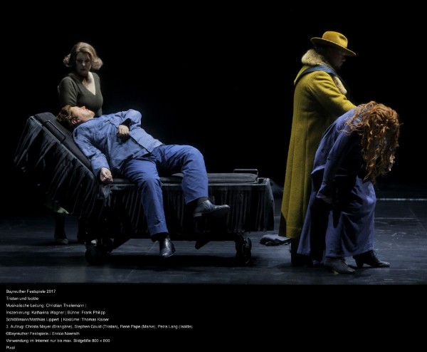 Im 3. Akt gibt es kein Happy End, auch nicht im Tode. Die Hoffnungsvision, die Gottfried von Straßburg in seinem Tristan-Epos noch verklärend in Form eines Chiasmus verkündet hatte – „ein man ein wip, ein wip ein man,/Tristan Isolt, Isolt Tristan“ -, wird durch Markes Handeln geradezu gewalttätig zertrümmert. Er reißt Isolde von der Leiche Tristans los, schleppt sie wie eine Beute fort und verwehrt ihr den Liebestod und damit die Vereinigung mit dem Geliebten im Tode, während seine Mannen die Anhänger Tristans dahinmeucheln. Das hatte noch bei der ersten Aufführung des Tristan in diesem Bayreuther Sommer zu wütenden Protesten einiger Festspielbesucher geführt, in der besuchten Aufführung am 20.08.2017 wurde auch die Regiearbeit Katharina Wagners und ihres Teams aber in den allgemeinen Jubel einbezogen.
