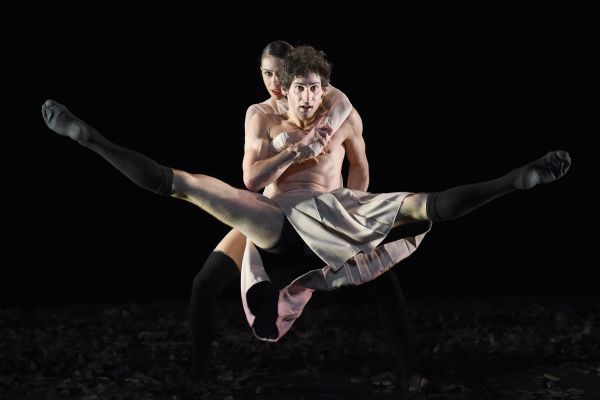 Nach der Pause gab es zunächst eine Arbeit von Eric Gauthier selbst aus dem Jahr 2009 mit dem Titel Orchestra of Wolves auf den 1. Satz von Beethovens 5. Sinfonie. Das groteske Stück zeigt einen Dirigenten, umgeben von sechs Orchestermusikern in Wolfsmasken, die sich ihrem Leiter bedrohlich nähern und ihn schließlich seines Amtes entheben. William Forsythes Herman Schmerman Duet von 1992 ist ein Klassiker des zeitgenössischen Tanzes in seiner Kombination von Neoklassik und Moderne. In diesem einzigen Beitrag des Abends, der auf Spitze getanzt wurde, überzeugten die elegante Bruna Andrade und der charismatische Nicholas Losada. Marco Goecke ist der Company seit langem verbunden und seit Januar 2019 auch zum Artist in Residence berufen. Sein Solo Äffi auf drei Songs von Johnny Cash stand für den solistischen Beitrag des Programms und markierte gleichzeitig dessen Höhepunkt. Theophilus Vesely entfesselte in einer fünfzehnminütigen tour de force in der typisch pathologischen Sprache des Choreografen mit flatternden, zuckenden, zappelnden, zitternden Bewegungen eine Atem beraubende Performance.