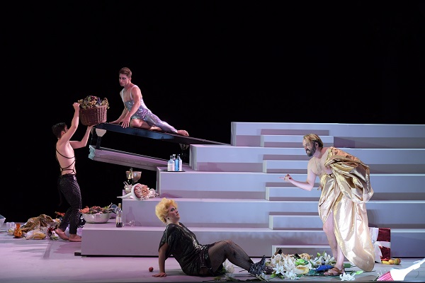 Von Gluck über Wagner und Verdi bis Puccini wird die halbe europäische Musikgeschichte durch den Fleischwolf gedreht. Da ertönt das Walhall-Motiv aus dem Rheingold, um die neureiche Protzerei des Emporkömmlings Trimalchio zu karikieren, den Peter Marsh mit schneidend hellem Tenor gibt. Eine Travestie von Bizets Carmen-Habanera wird von Susanne Gritschneder als Fortunata als hinreißendes Chanson serviert. Ambur Braid darf sich als Scintilla nicht bloß einmal mehr an halsbrecherischen Koloraturen beweisen, sondern vollbringt das auch noch mitunter kopfüber zu akrobatischen Kunststückchen. Das gesamte Ensemble hat großen Spaß an der bunten Revue, die kurzweilig am Publikum vorüberzieht. Nelly Danker hat dies im abstrakten Bühnenbild von Kaspar Klarner aber allzu harmlos arrangiert. Ein Fließband im Dauerbetrieb, auf dem unablässig die Bestandteile des Büffets für das Gelage des Trimalchio herbeifahren, um dann am Ende des Fließbandes zu Boden zu stürzen, markiert als überdeutliche Metapher die verschwenderische Dekadenz. Wen kümmert’s? Madernas linke Kapitalismuskritik ist eben auch längst zu einem Museumsstück geworden.