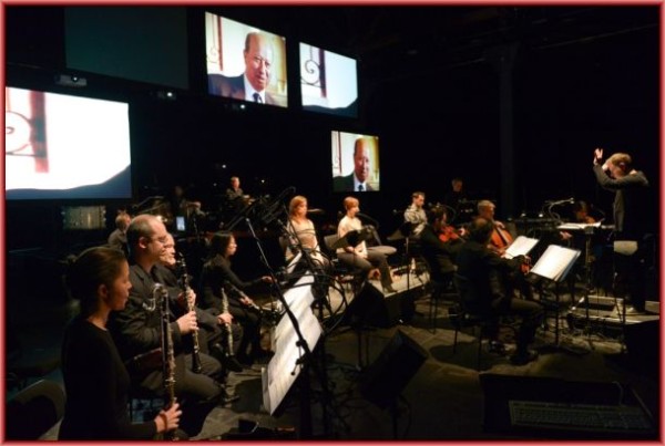 Dazu sang ein vierköpfiges britisches Sängerensemble (mit Wangenmikrophonen): die Sopranistin Joanna L’Estrange, die Mezzosopranistin Micaela Haslam, der Tenor Alastair Putt und der Bariton Tom Bullard. Die bei dieser „Video-Oper“ wichtige Klangregie oblag Norbert Ommer, für das Lichtdesign zeichnete Jürgen Koß verantwortlich.