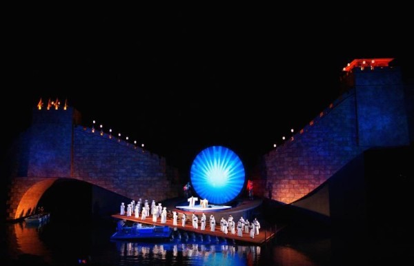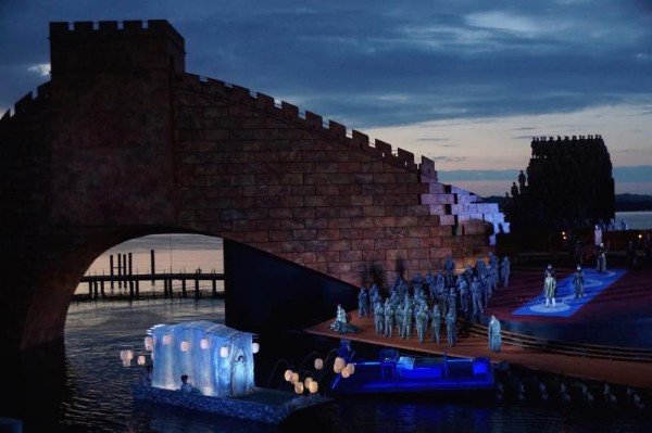 Marco Arturo Marelli bedient weiter alle chinesischen Klischees: es gibt es die putzige, aber dennoch respektable China-Legoland-Mauer, weiterhin beeindruckt die allgegenwärtige von innen beleuchtete Terrakotta-Armee (einmal oben auf der Mauer platziert und parallel halb im Bodensee versunken), es gibt vielfältige Drachen und Lampions, die üblichen Wasserspiele und Feuerwerk, schöne Balletteinlagen und aus Japan importierte Kungfu-Fighting-Tänzer. Disneyland-Atmosphäre. Also alles Dinge, die das Publikum erfreut und die man liebt. Ein kritischer Sitznachbar nuschelte mir ins Ohr: Genauso so stellt sich bestimmt der typische Amerikaner China vor. Ja… dem könnte man zustimmen.