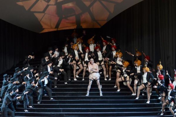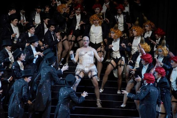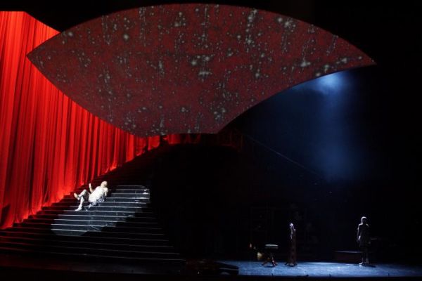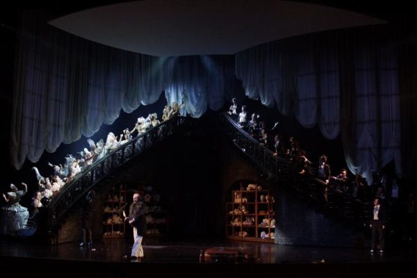 Eine große Neudeutung zeigte der Regisseur Stefan Herheim nicht, aber ein nicht uninteressantes Puzzle der Teile des eigentlich unvollendeten Werks. Bis zur Pause war dies alles auch recht gelungen. Ein eindrucksvolles Vorspiel auf dem Theater, die Bühne beherrschend eine große „Hollywoodtreppe“, die sich dann öffnete und den Blick auf Luthers Weinkeller in Berlin freigab. Technisch alles ausgezeichnet und auch optisch sehr schön. Das wirklich geglückte Bühnenbild schuf Christof Hetzer. Nach einer kurzen technischen Panne ging es in das Physikalische Kabinett in Paris, also zu Olympia. Bis dahin war alles toll durchdacht und so ging man wirklich positiv eingestellt in die Pause. Danach wurden es dann allerdings der Strapse zu viel. Von Spalanzanis Haus, in dem noch zum Teil die Akteure auf der Bühne liegen, wechselte die Drehbühne zum Haus des Geigenbauers Crespel in München. Die Erscheinung der Mutter (diese ausnahmsweise nicht in Strapsen !) war wieder auf der Hollywoodtreppe und sah wie Marylin Monroe aus.