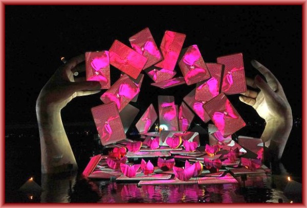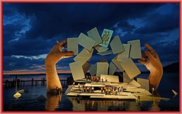 Wie es gelingt, auf über 50 Spielkarten der Größe 4×8 Meter noch Bilder und Videos (Luke Halls) zu projizieren, bleibt auch mir ein Rätsel. Wenn sich dann auch noch einige dieser Riesenkarten bewegen und verschieben, dann ist die bühnentechnische Zauberwelt vollendet. Absolut geniale Bilder, vor allem wenn am Ende die Kartenbilder wegfließen, wie vom realen Regen verwaschen. Das passt als wenn Unwetter eingeplant wären. Auch ist es schön, wenn die Sänger hier auch wie bei Pop-Events großflächig live erscheinen. Das grandiose, wie eingefroren wirkende Bühnenbild der die Karten hochwerfenden Hände (Es Devlin) ist Oscar-preiswürdig, wäre es ein Film. Immerhin gilt Devlin schon jetzt als Megastar des Bühnenbildes und hat eine Weltkarriere bereits hinter sich – neben diversen Opernproduktionen an großen Häusern gestaltete sie 2012 die Abschlussfeier der Olympischen Spiele in London, Bühnenshows internationaler Popkünstler und Modezaren bedienen sich regelmäßig ihres Genies (u.a. Louis Vuitton, Kanye West, Lady Gaga, Beyonce…)