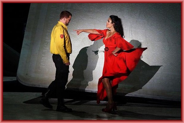 Oper in Bregenz ist stets ein Spektakel – ein musikalisch, zirzensisches Gesamtkunstwerk mit Feuerwerk, Wasser und atemberaubenden Stunts. Eine zauberhafte Erlebniswelt mit der Musik von Bizet tut sich vor den staunenden Augen der Zuschauer auf. Daß dies am Ende noch kaum etwas mit Bizets ohnehin meist völlig überschätztem Werk – Folklore hin, Tiefenpsychologie oder Seelendrama her – namens „Carmen“ zu tun hat, ist völlig egal! Darum geht es ja auch gar nicht, denn auf der Giganto-Bühne ist Carmen ein kleiner roter Punkt und Don José ein kleiner gelber im wilden Wirrwarr einer Hundertschaft höchst mobiler Statisten, Künstler und Protagonisten. Hier will man das Publikum auf höchstem technisch zu realisierbarem Niveau, mit phänomenaler Tontechnik und unglaublichen dreidimensionalen Bühnenbildern einfach nur unterhalten und begeistern.