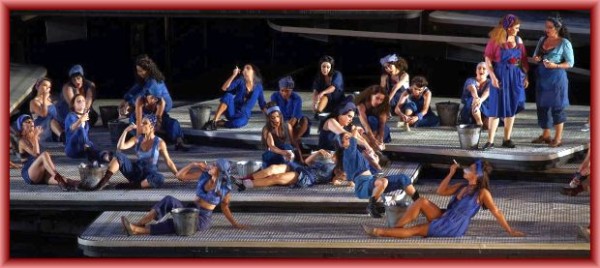 Wenn also Micaela ganz oben in 50 Metern Höhe auf dem Finger der Kartenspielerin erscheint und singt, dann hört man sie auch von oben. Natürlich wird sie für den spektakulären Abstieg gedoubelt, was der überwiegende Teil des Publikums kaum merkt, denn das ist so perfekt gemacht, wie der Austausch der singenden Carmen in die optisch gleiche Stuntfrau, die sich dann auf der Flucht ins Wasser stürzt und davon krault. Und wenn am Ende Carmen im seichten Wasser strampelnd mit dem Gesicht nach unten solange heruntergedrückt wird, bis sie zu Tode erschlafft, dann leistet die jeweilige Sängerin Gewaltiges und selbst der abgebrühte Rezensent konnte keinen Austausch wahrnehmen; offensichtlich arbeitet man hier mit Tauchern und nicht sichtbaren Atemgeräten. Ein sensationeller Schluss.